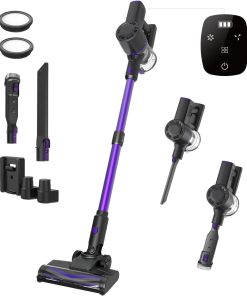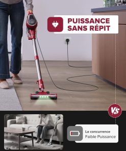 Acheté pour remplacer mon aspirateur encombrant, cet aspirateur balai filaire m’a agréablement surprise : léger, esthétique, tient debout tout seul et très performant. Il est suffisant pour nettoyer toute la maison malgré cinq chats (poils, litière, croquettes) et tient bien sur les tapis ; la brosse rotative est démontable, donc l’entretien est facile même avec des cheveux très longs. Pas trop bruyant, excellent rapport qualité-prix, il a remplacé mon autre aspirateur et je le recommande vivement.