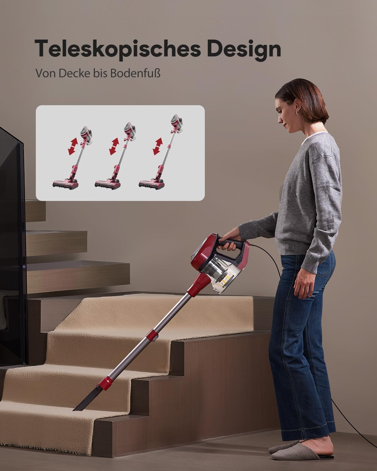 Aspiradora estupenda con mucha potencia de succión y diseño moderno; aspira muy bien la tapicería, alfombras y todo tipo de suelos. Trae varios accesorios para llegar a cualquier sitio y recoge sin problema los pelos de mis gatos y los raíles de las ventanas. Al ser con cable no hay que preocuparse por cargarla y el cable de 7 metros cubre mucho espacio. El depósito y el filtro se limpian muy bien, incluye un filtro de repuesto y la luz frontal permite ver el polvo; estoy muy contenta, la veo muy eficiente para su uso.