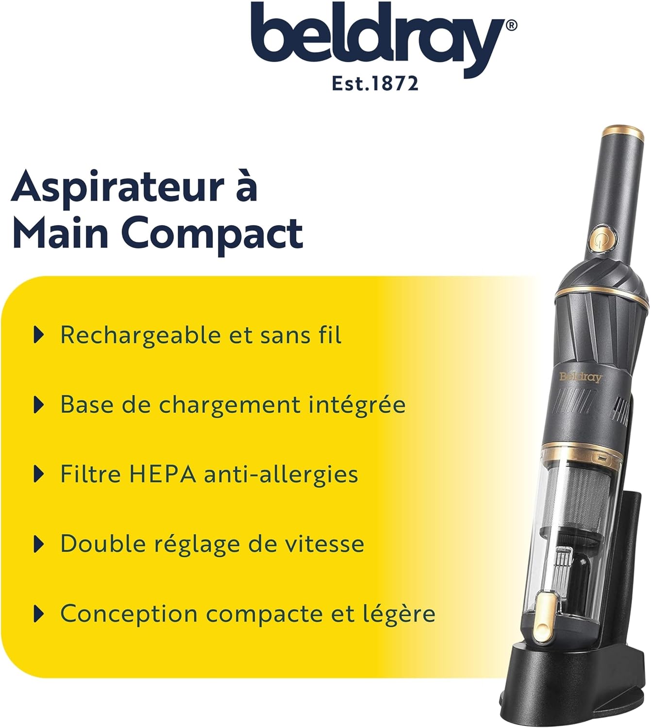 - ASPIRATEUR À MAIN: Parfait pour les nettoyages rapides, cet aspirateur à main Beldray Airlite peut être utilisé dans les escaliers, les voitures, les tissus d’ameublement et les zones difficiles d’accès.
