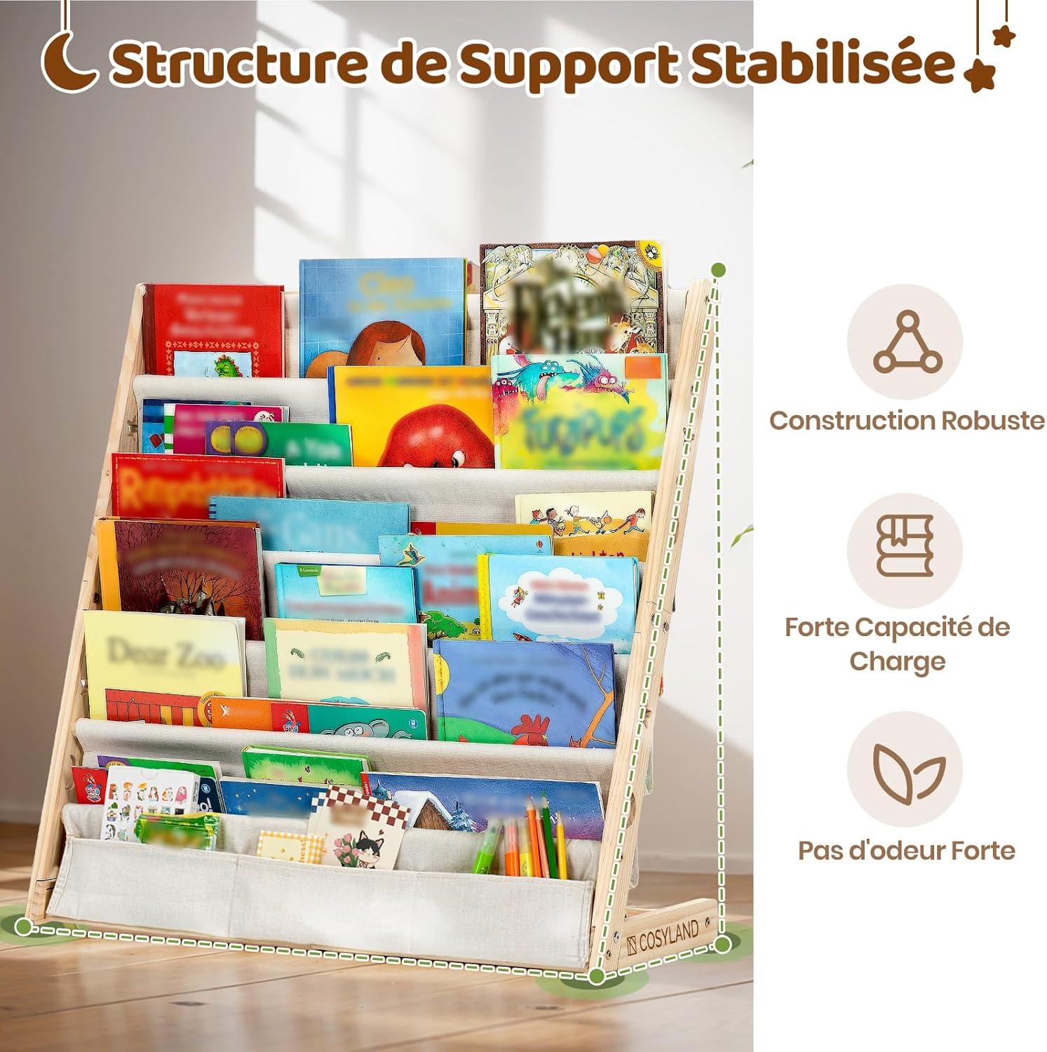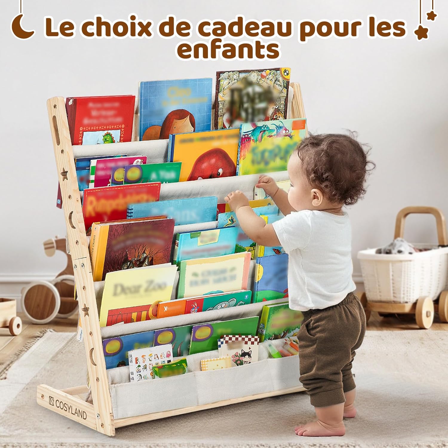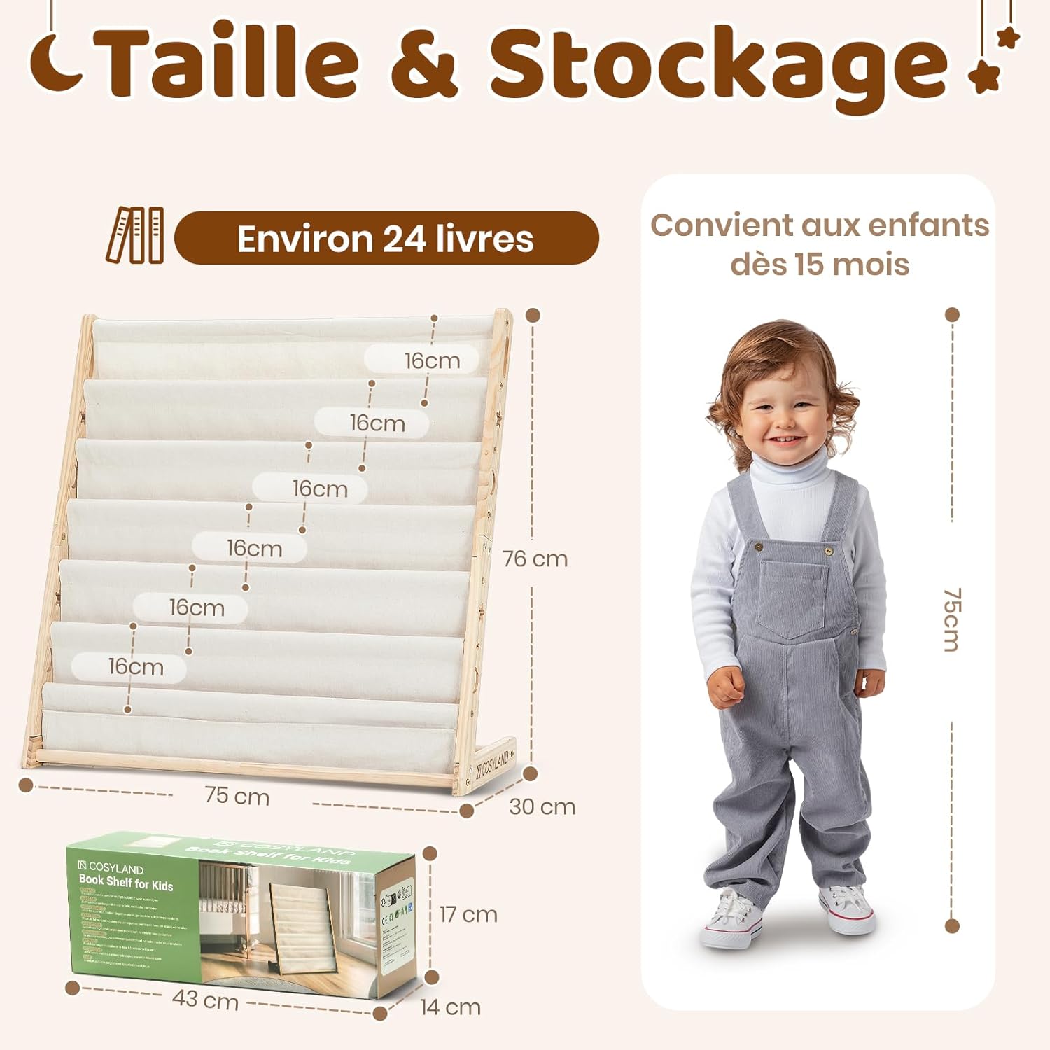 Très satisfaite de la bibliothèque COSYLAND en bois massif: stable, bien finie et facile à assembler. Les 7 niveaux offrent un rangement pratique pour livres et jouets, le design Montessori et la finition naturelle s’intègrent parfaitement dans une chambre d’enfant. Solide et fonctionnelle, excellente qualité pour le prix.
