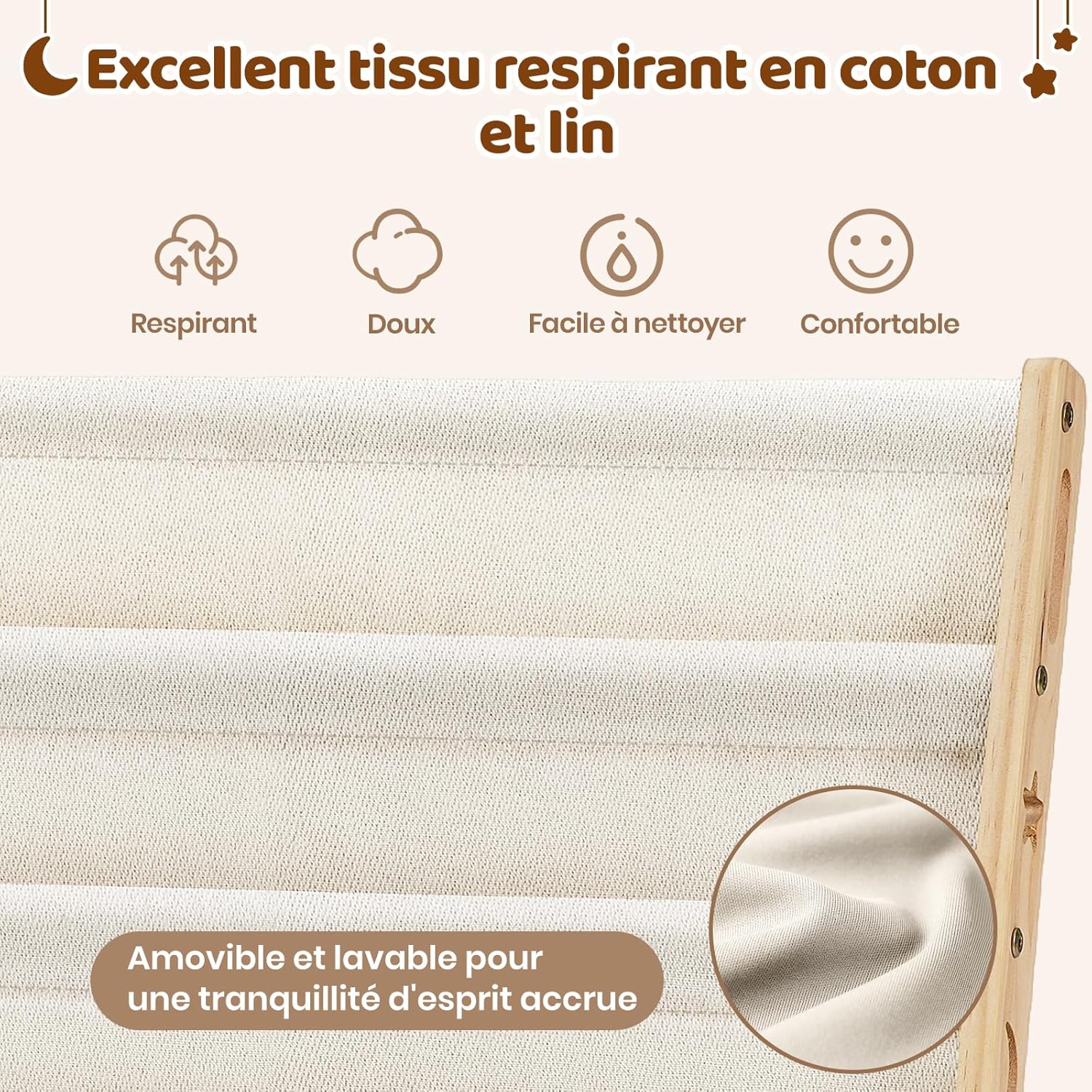 - Poches en Tissu Résistantes et Faciles à Nettoyer : Équipée de poches en tissu de haute qualité, cette bibliothèque permet de ranger des livres de différentes tailles. Les poches sont faciles à entretenir, offrant une solution de rangement pratique et durable