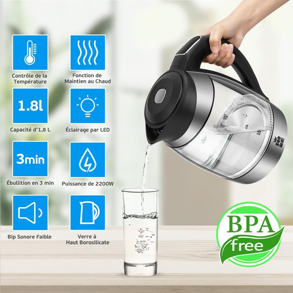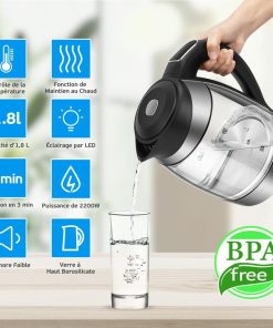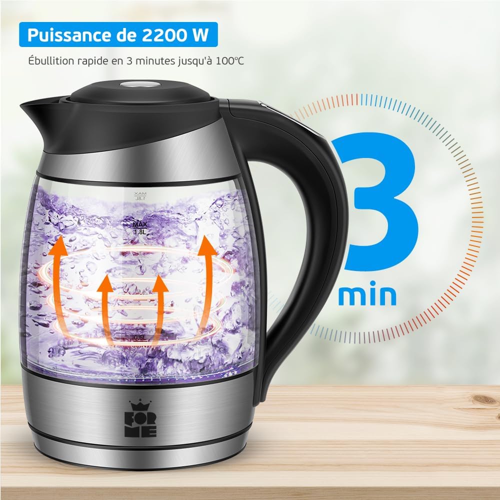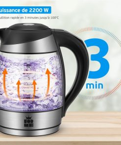 - Sept couleurs d'éclairage LED. Lorsque la bouilloire chauffe l'eau, l'éclairage LED change de couleur 7 fois, dans l'ordre suivant : blanc, vert, bleu clair, bleu, violet, jaune et rouge.