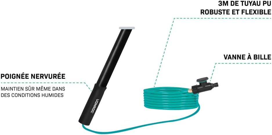 Bon produit, complet avec accessoires. Facile à monter et à brancher sur un tuyau d’arrosage. Pas lourd, facile à utiliser même déplié. Longueur réglable.