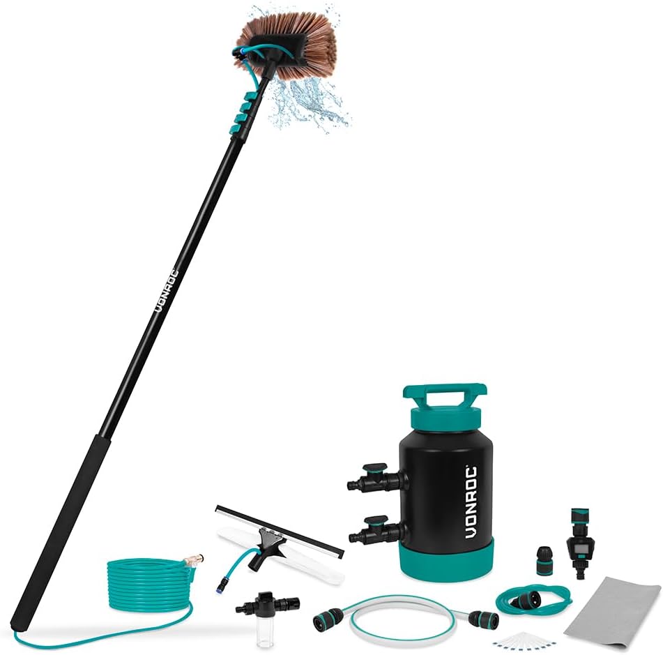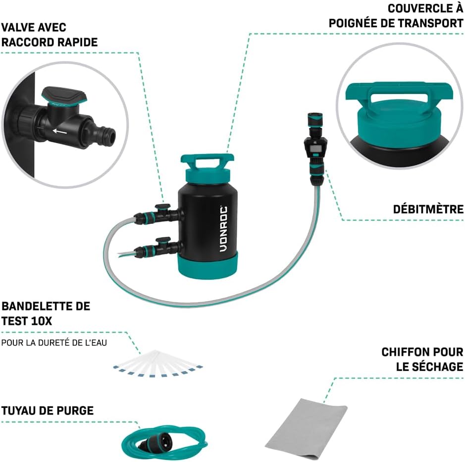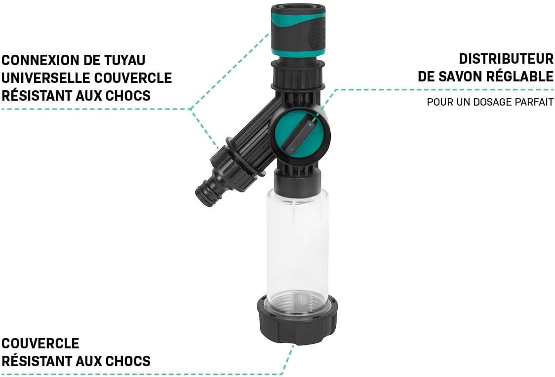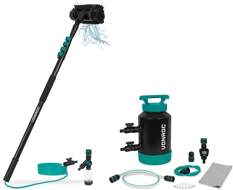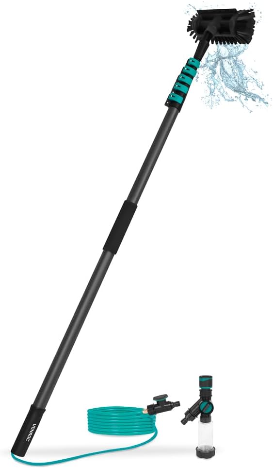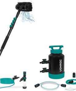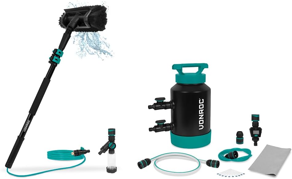 - Ensemble complet : Livré avec une tête de brosse polyvalente, un tuyau d’arrosage intégré, un distributeur de savon et un adoucisseur d’eau avec tous les accessoires nécessaires pour un nettoyage efficace.