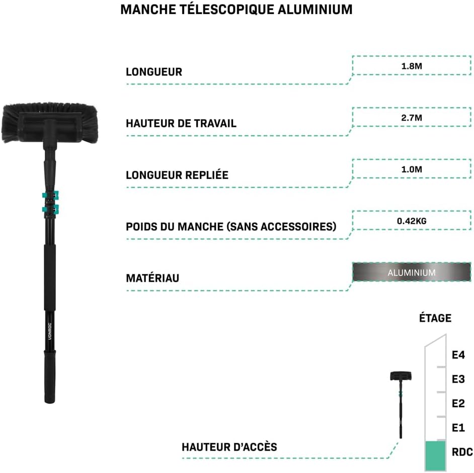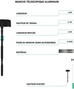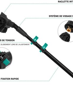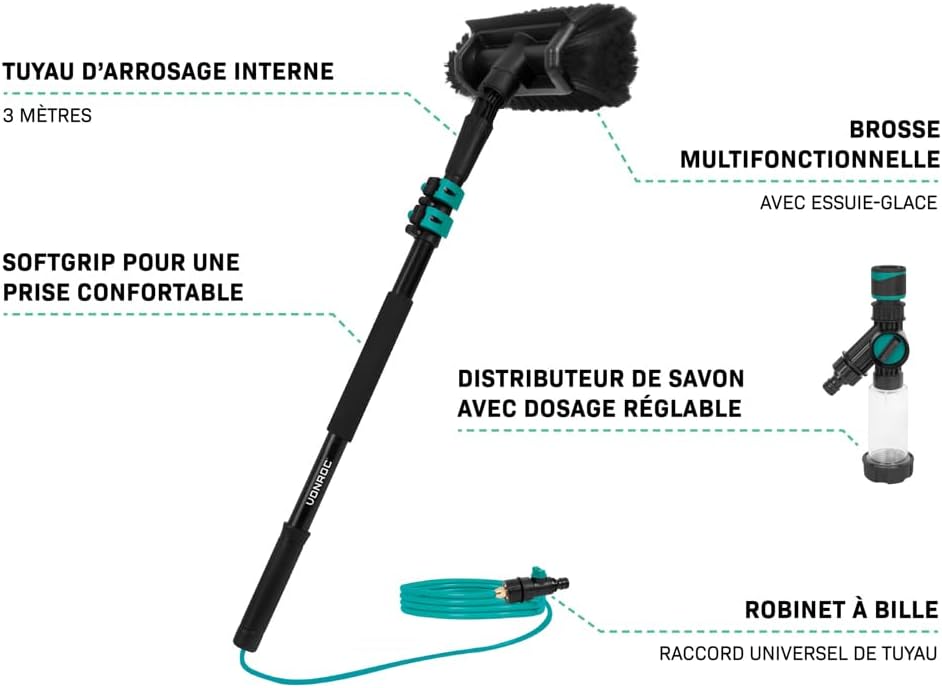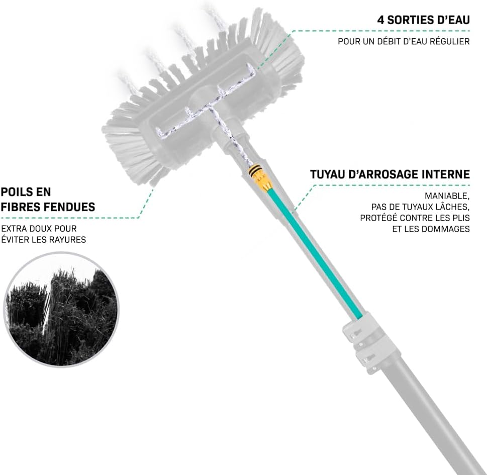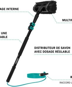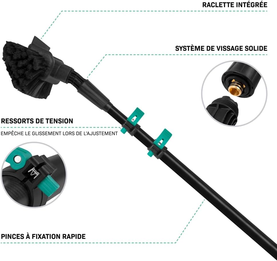 - Brosse à laver télescopique : La brosse réglable de 0,93 m à 1,80 m est idéale pour le nettoyage des véhicules et des surfaces basses, offrant une grande commodité et une utilisation facile.