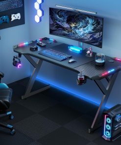 Super bureau gaming 140 x 60 cm, très stable et simple à monter. Le plateau effet fibre de carbone est solide et élégant, les LED créent une ambiance sympa sans être agressives, et le porte-gobelet avec le crochet pour casque sont vraiment pratiques au quotidien. Assez d’espace pour mon écran et mes périphériques, très bon rapport qualité-prix.