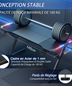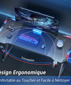Bureau gaming bien conçu et fonctionnel, dimensions 140 x 60 cm offrant suffisamment d’espace pour écran et périphériques, plateau en fibre de carbone au rendu sobre et solide, éclairage LED discret qui améliore l’ambiance, porte-gobelet et crochet pour casque pratiques, montage assez simple et bonne stabilité, adapté aussi bien pour le jeu que pour le travail.