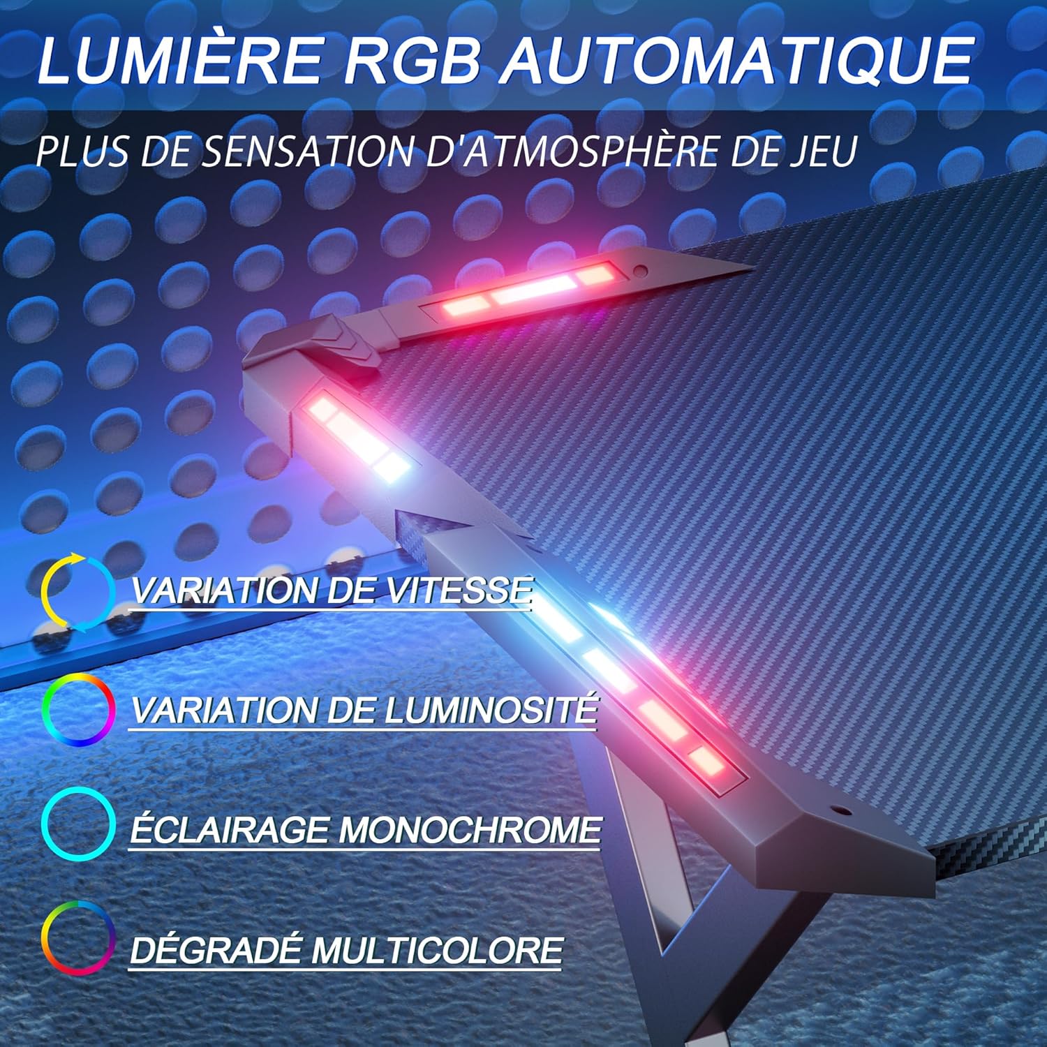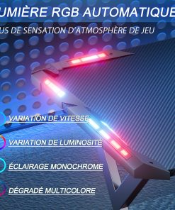 - 【Éclairage RGB】 Ce bureau gaming est équipé de deux bandes LED de chaque côté, offrant plusieurs options de couleurs, vitesses et niveaux de luminosité pour ajuster l’ambiance lumineuse selon vos préférences. L’éclairage RGB crée une atmosphère immersive qui vous plonge pleinement dans l’univers du jeu.