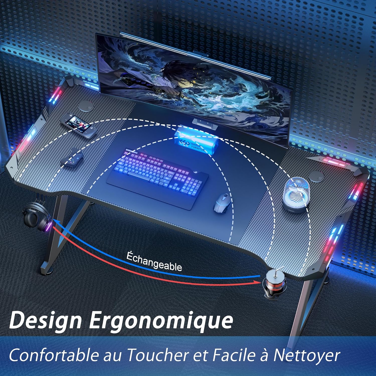 Bureau gamer 140 x 60 cm vraiment top : le plateau en fibre de carbone est solide et facile à entretenir, les LED créent une ambiance agréable sans être envahissantes, et le porte-gobelet ainsi que le crochet pour casque sont très pratiques au quotidien ; montage simple et bonne stabilité, parfait pour de longues sessions de jeu.