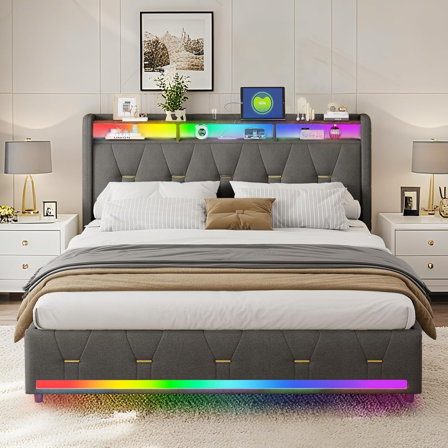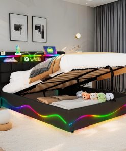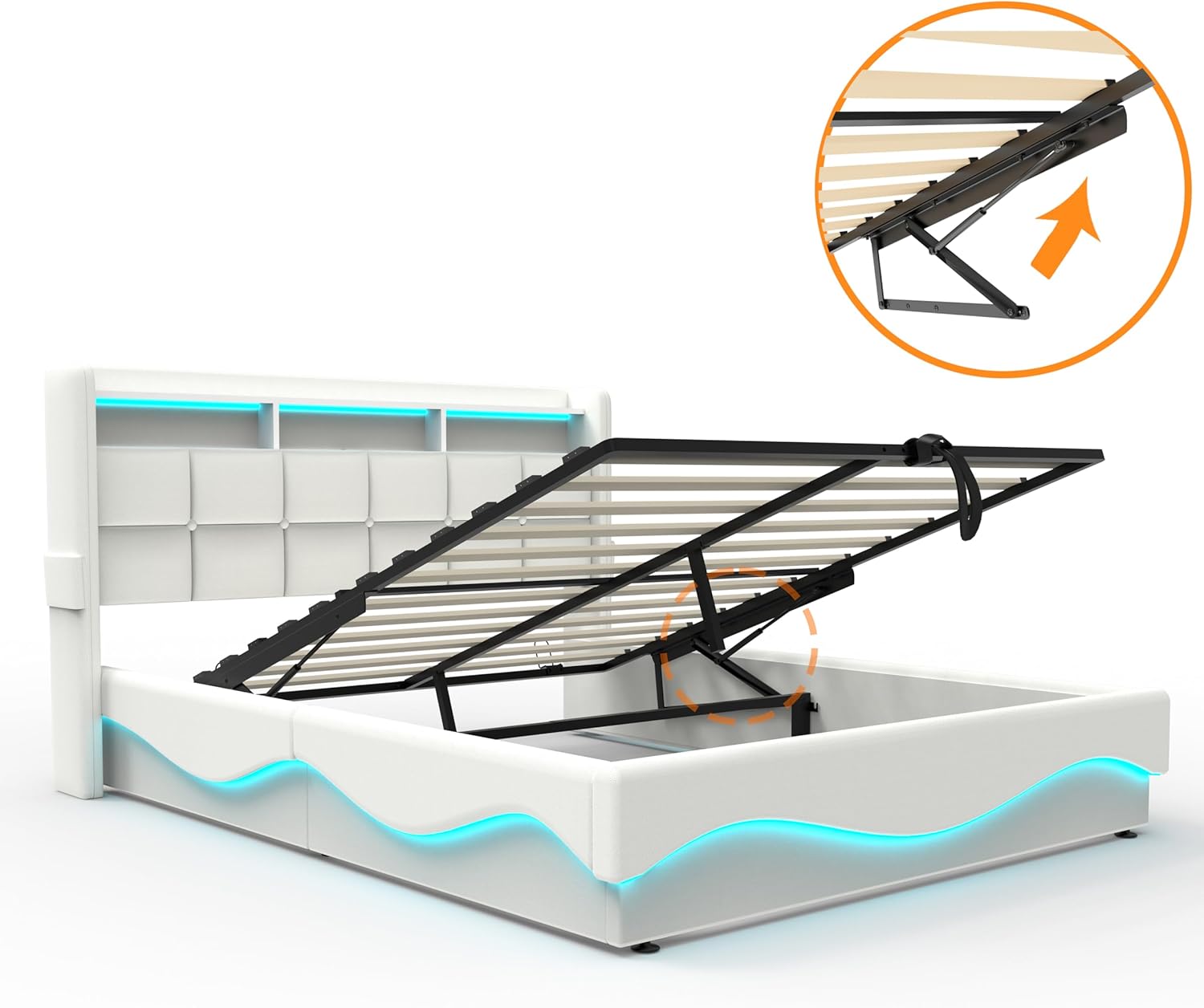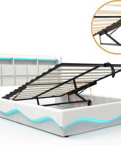 - 【Grand espace de rangement sous le lit】Lit avec rangement intégré. Ce cadre de lit dispose d’un vaste espace de stockage sous le lit, optimisant l’espace sans occuper de surface au sol supplémentaire. Il permet de ranger facilement la literie hors saison, les oreillers de rechange et les vêtements. Des pistons à gaz haute performance garantissent un accès facile au rangement. Le produit est livré en deux colis séparés qui peuvent arriver à des moments différents.