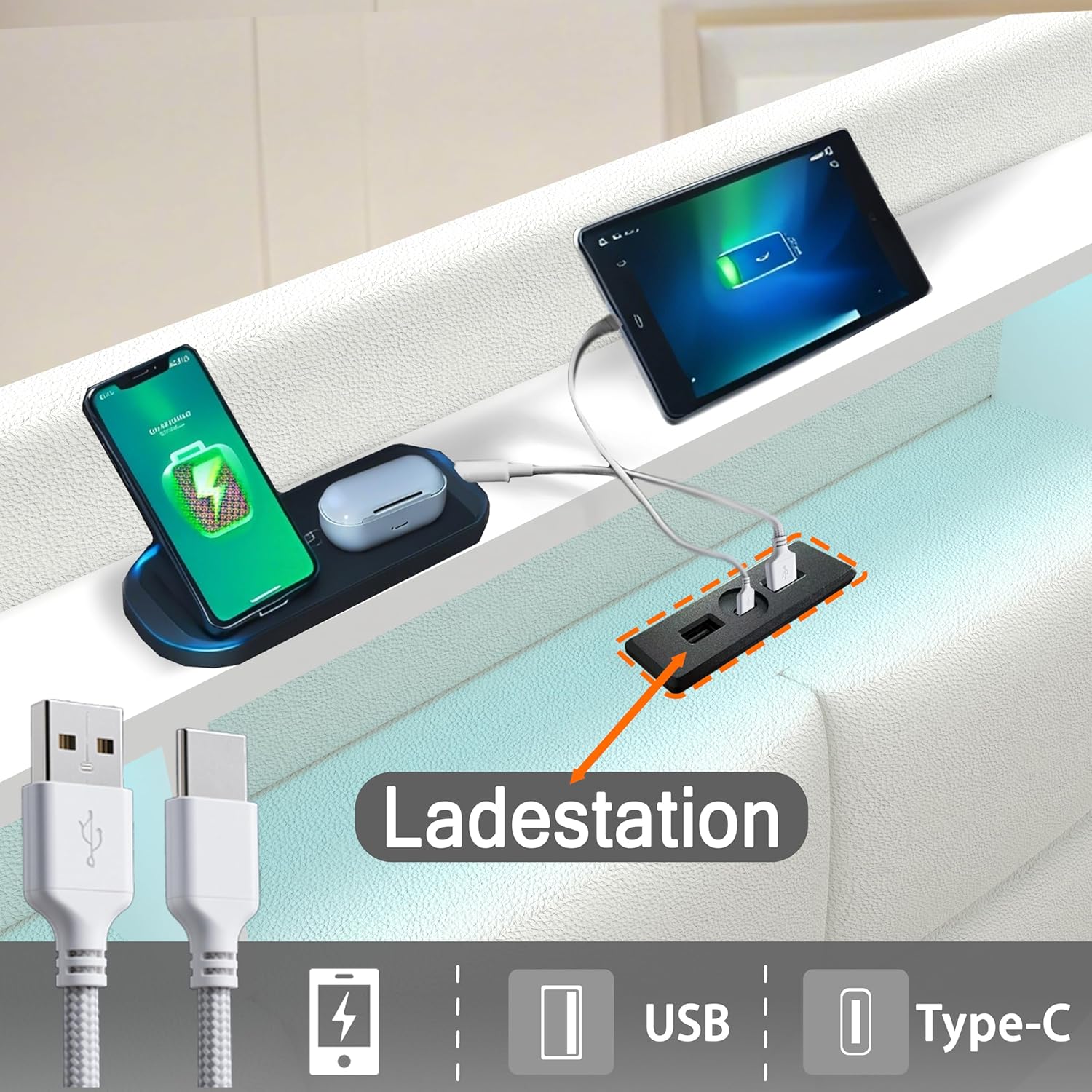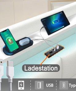 - 【Station de Chargement 2USB+1Type-C】 Lit avec station de chargement. Cette tête de lit comporte une station de chargement 3 ports (1 Type-C, 2 USB) permettant le chargement simultané de plusieurs appareils. De part et d’autre des ports, des rebords de 10 cm de largeur maintiennent solidement téléphones et tablettes pendant le chargement, éliminant l’encombrement des câbles. Le design élégant intègre parfaitement la fonction de chargement pour une apparence épurée et moderne.