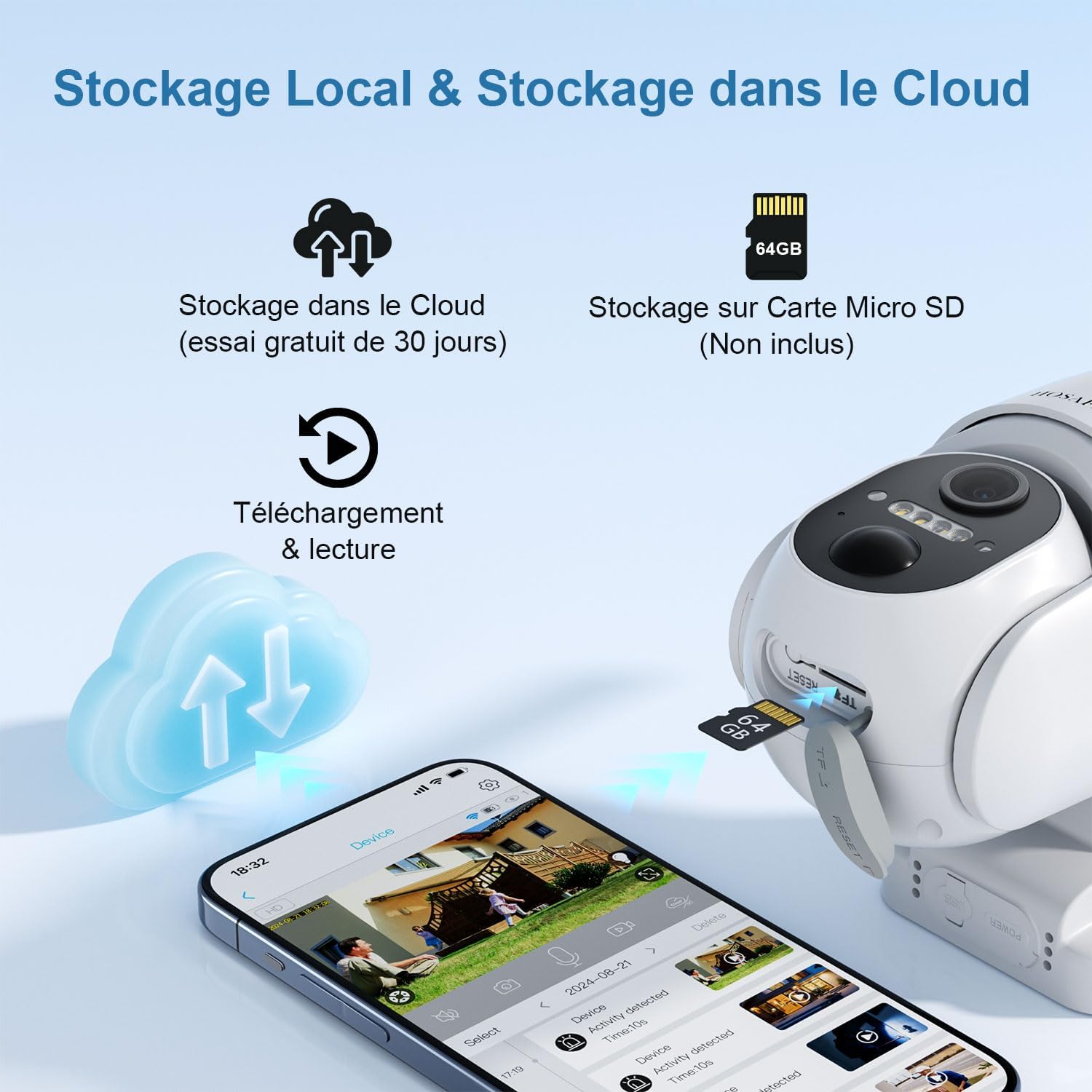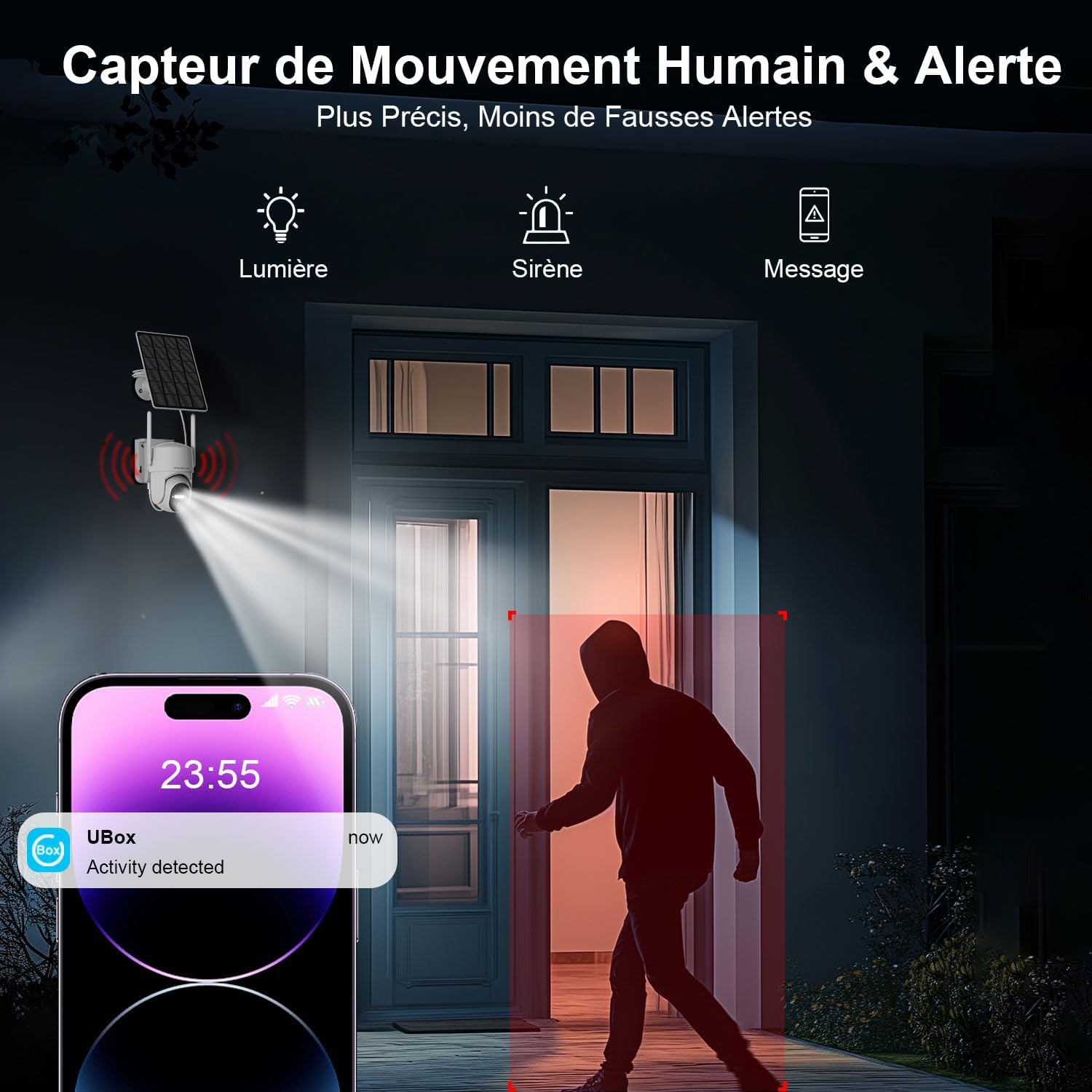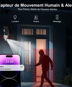 - Détection humaine PIR avec alertes: La caméra solaire enregistre et envoie une notification « Activité détectée » à votre téléphone. Le capteur intelligent minimise les fausses alertes causées par les animaux, pour une surveillance plus précise