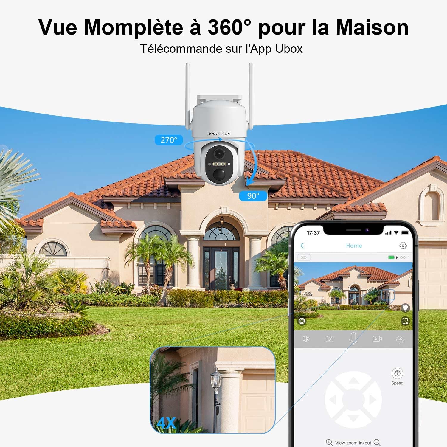 - Contrôle PTZ à distance 360°: La caméra solaire extérieur WiFi sans fil offre un panoramique à 270°, une inclinaison à 90°, et un zoom 4X, contrôlables à distance via votre smartphone pour une surveillance complète sans angles morts.