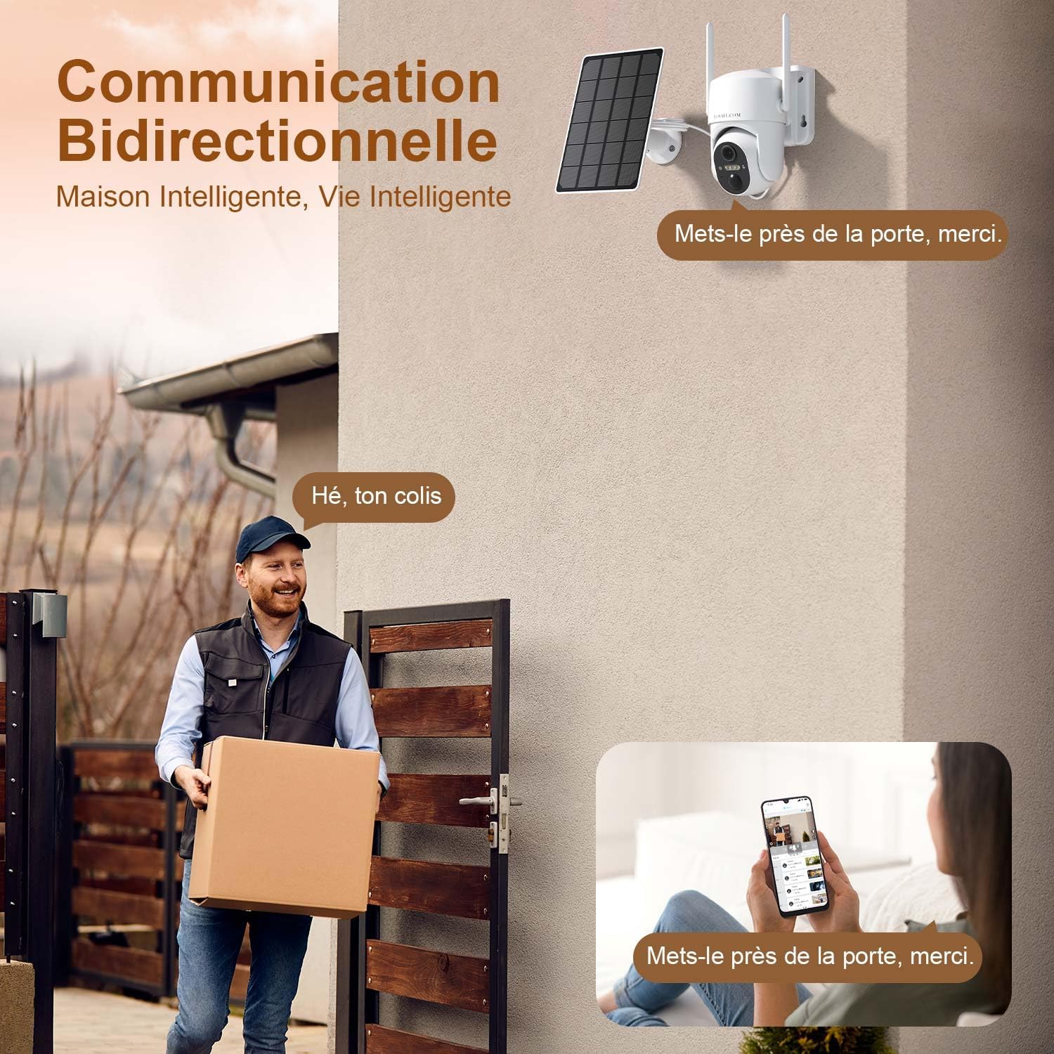 - Audio bidirectionnel en temps réel : Communiquez directement avec les visiteurs grâce au microphone et au haut-parleur intégrés de cette caméra surveillance extérieure, peu importe où vous vous trouvez.