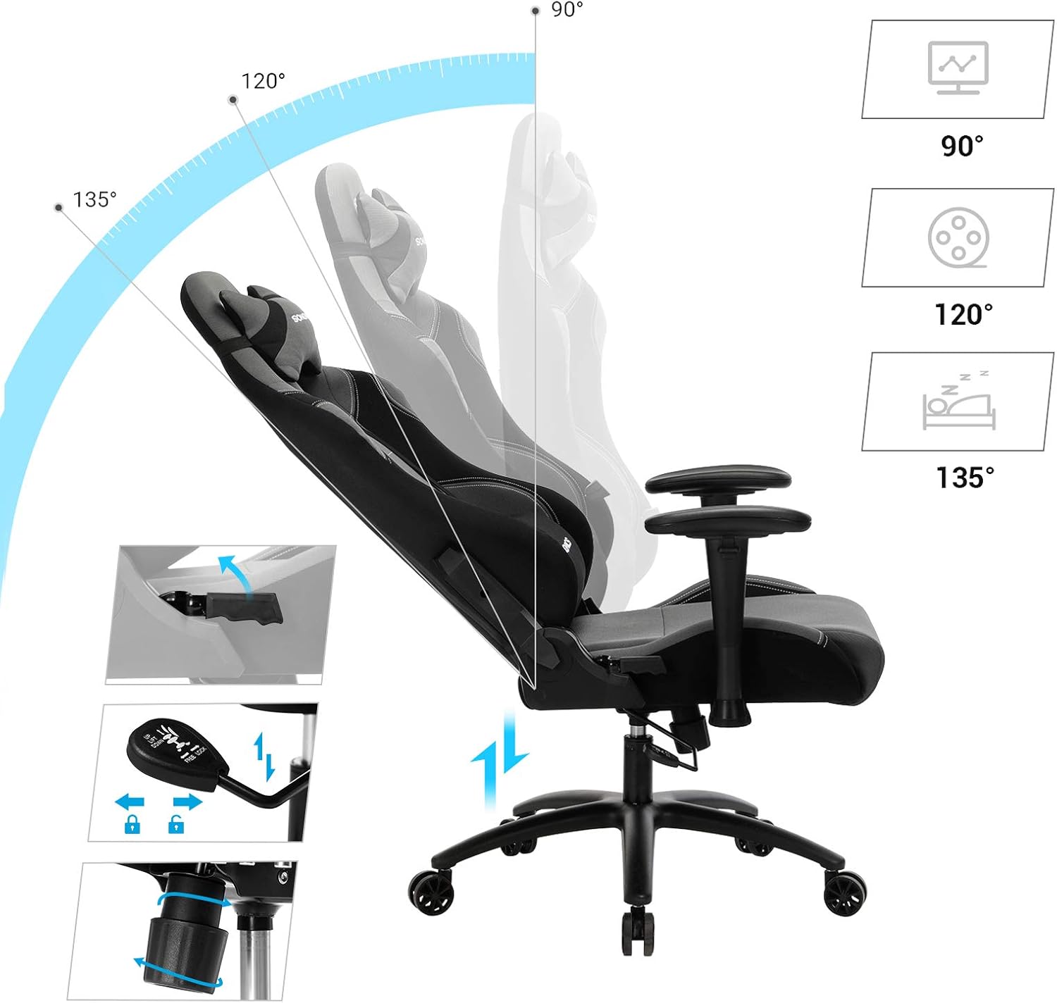 - LE DOSSIER EST RÉGLABLE SUR PLUSIEURS NIVEAUX : Il y a un total de 16 niveaux de réglage, il peut être incliné jusqu’à 135° afin que vous puissiez atteindre une position allongée