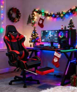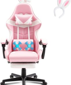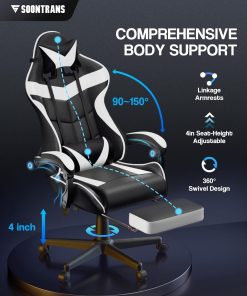 La chaise Soontrans offre un bon équilibre entre confort et soutien pour le travail ou les jeux en direct. Le repose-pieds, l’appui-tête et le coussin lombaire massant rendent les longues sessions moins fatigantes, le rembourrage est agréable et le design blanc reste sobre et facile à intégrer.