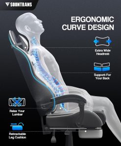 - Confort de jeu : la chaise de jeu Soontrans dispose d’un appui-tête amovible en mousse à mémoire de forme qui protège efficacement la colonne vertébrale et le cou. Le coussin lombaire avec fonction de massage, fait plus de 20 000 vibrations par heure pour soulager efficacement la fatigue pendant de longues périodes de travail ou de jeu. Le coussin lombaire a un câble USB à brancher sur une prise murale. Grâce à l’interrupteur sur le câble, vous pouvez allumer et éteindre la fonction massage