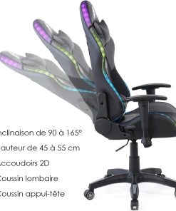 Chaise confortable et stylée, l’éclairage LED apporte vraiment une ambiance gaming personnalisable avec la télécommande, les accoudoirs 2D sont pratiques et le dossier offre un bon maintien. Montage simple, matériaux solides et bon rapport qualité-prix, je recommande ce fauteuil.