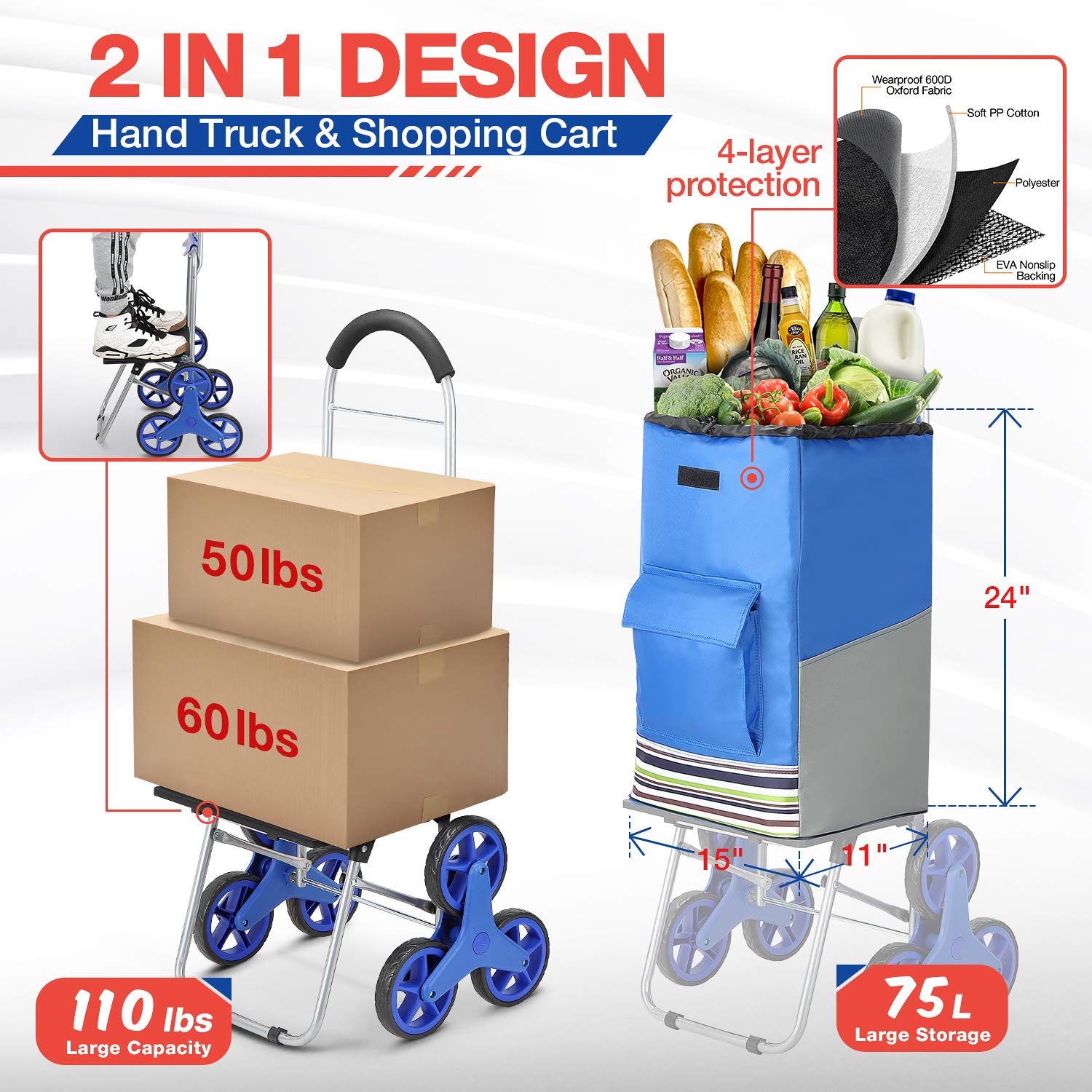 Chariot très pratique et solide, le mode 2 en 1 est facile à utiliser et le sac de 75 L offre beaucoup d’espace; le cordon élastique fourni maintient bien les courses et les roues montent les escaliers sans bruit, ce qui m’a vraiment facilité les trajets au marché. Je recommande.