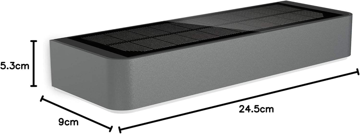 - Contenu de la livraison : lampe solaire, matériel de montage (2x vis, 2x chevilles), caches de capteur| Dimensions (L x l x H) : 91 x 242 x 38 mm | Poids : 0,6 kg | Détail de la tension d’alimentation : solaire, hors-réseau, batterie au lithium-ferrum 4000 mAh | Numéro d’article : 052959
