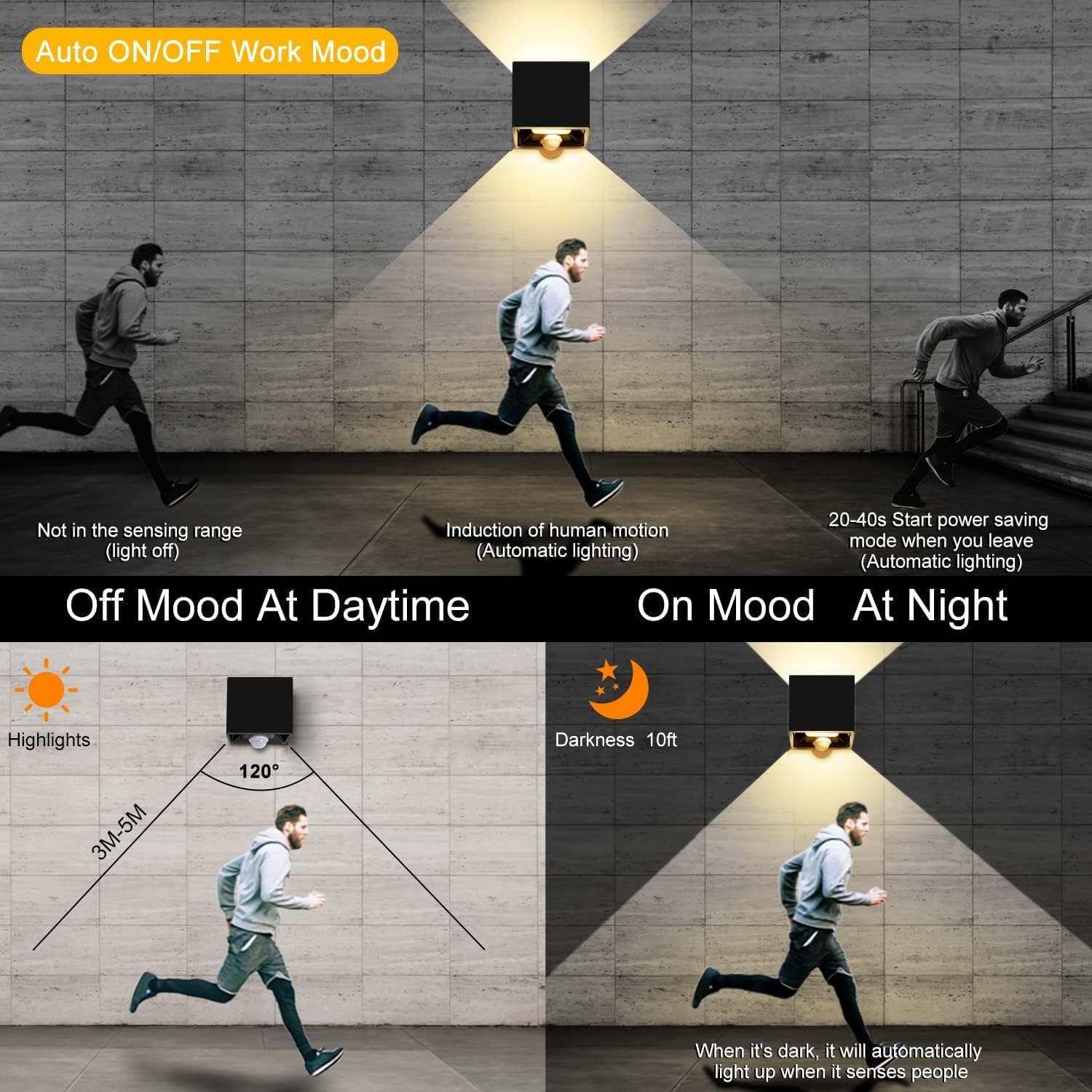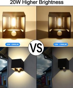 - 20w applique avec détecteur de mouvement: détecteur de mouvement + capteur de lumière, plus pratique et économe en énergie. Le crépuscule s’allume automatiquement et l’aube s’éteint automatiquement. Détection de mouvement: distance de détection de 3 à 5 mètres, temps de maintien de 30 secondes.