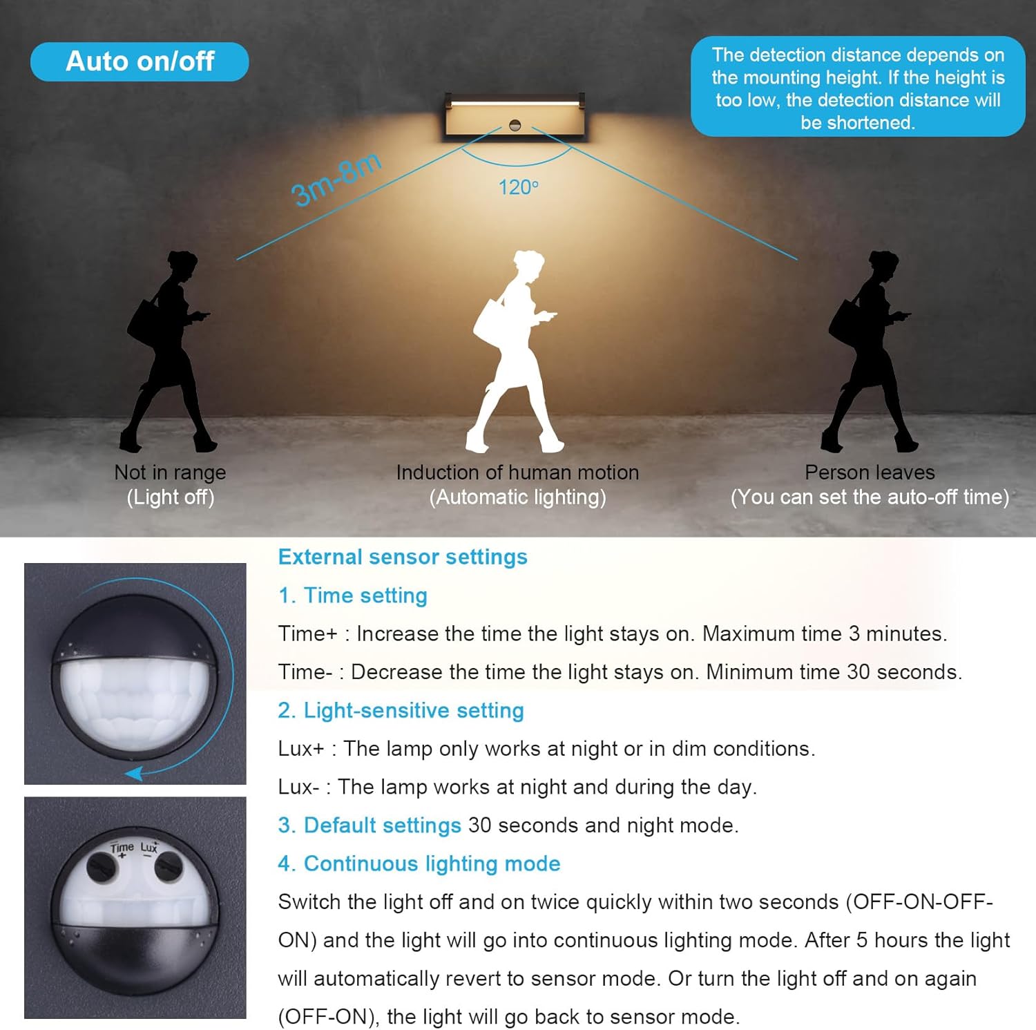 - 【Fonction de détecteur mouvement】1. applique extérieure à allumage automatique dans les 3 à 8 m. 2. Vous pouvez régler le capteur pour qu’il fonctionne uniquement la nuit, ou vous pouvez le régler pour qu’il fonctionne de jour comme de nuit. 3. L’applique murale s’allumera automatiquement lorsque quelqu’un passera. Et il s’éteint automatiquement lorsque rien ne bouge (vous pouvez régler le temps d’extinction de l’applique murale de 30 secondes à 3 minutes).