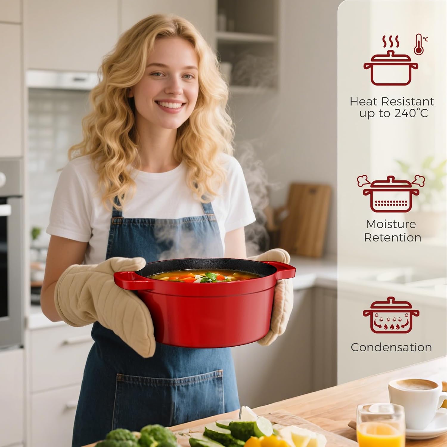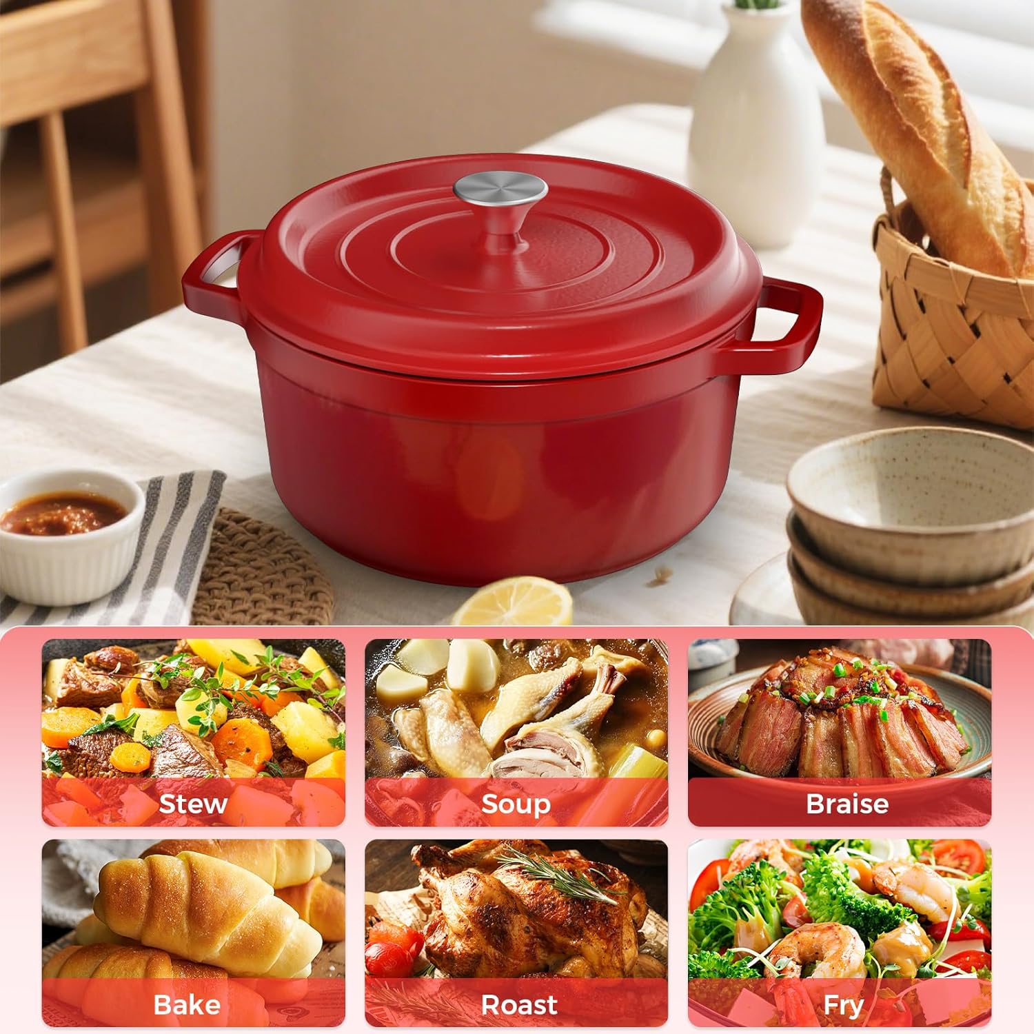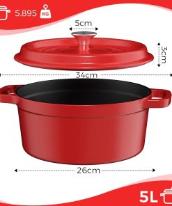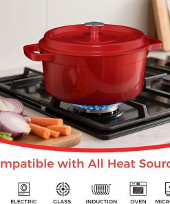 Cocotte solide et bien finie, idéale pour préparer des soupes, ragoûts ou même du pain ; la capacité 5 L est pratique pour les repas en famille, le couvercle s’ajuste bien et le revêtement antiadhésif facilite le nettoyage, le rouge donne une belle touche en cuisine.