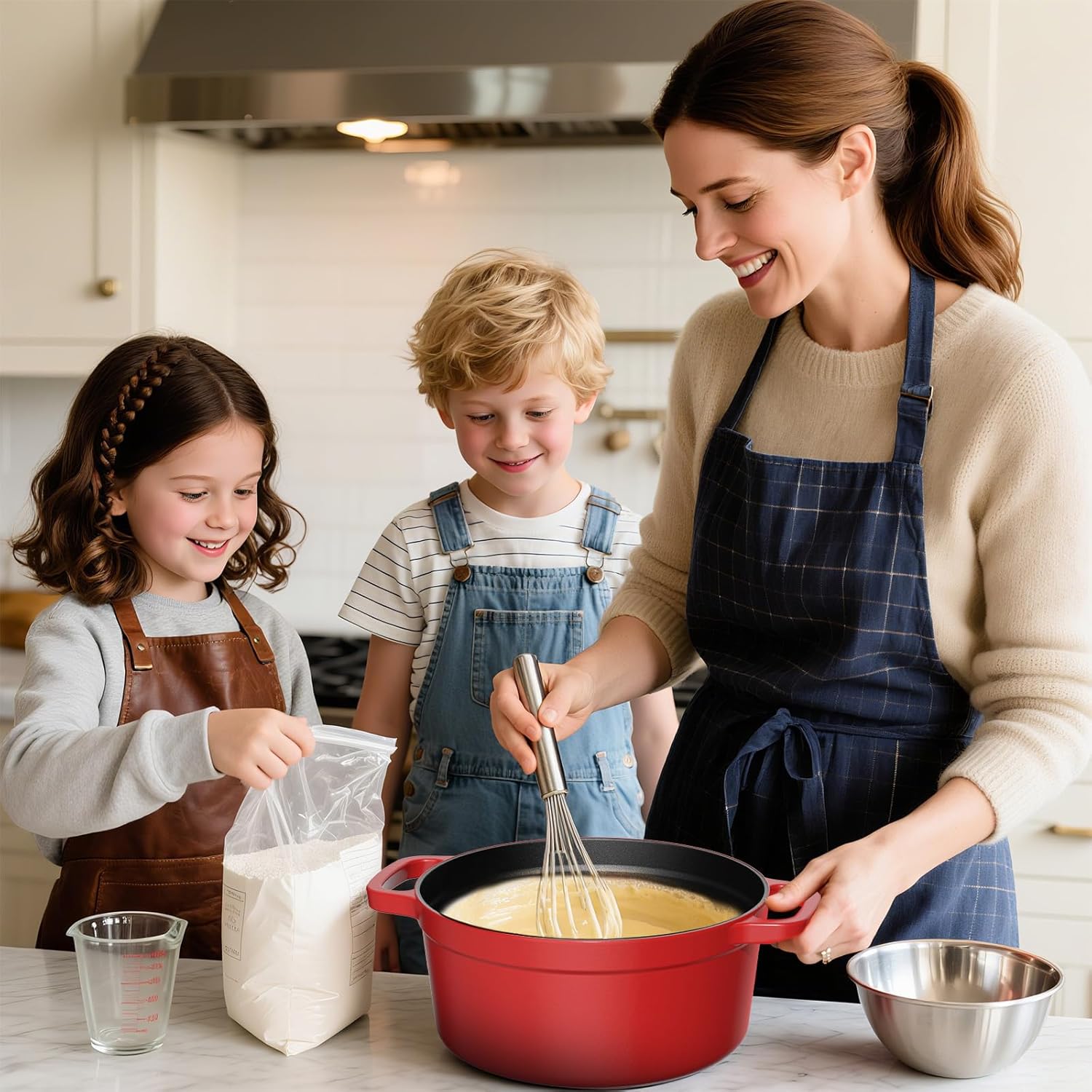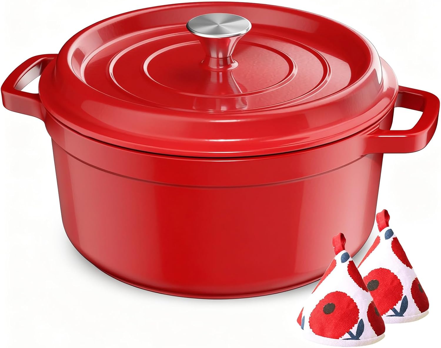 Super cocotte en fonte émaillée de 5 L : chauffe uniformément, retient bien la chaleur et convient aussi bien aux soupes et ragoûts qu’à la cuisson du pain. Le revêtement facilite le nettoyage, le couvercle s’ajuste parfaitement et la couleur rouge est magnifique dans la cuisine.