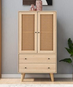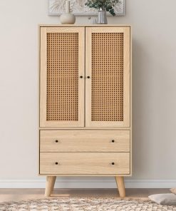 La commode en rotin offre un look naturel et sobre, avec deux portes et deux tiroirs bien pensés pour un rangement organisé; elle s’intègre discrètement dans un couloir, une chambre ou une salle à manger et donne une impression de qualité tout en restant polyvalente.