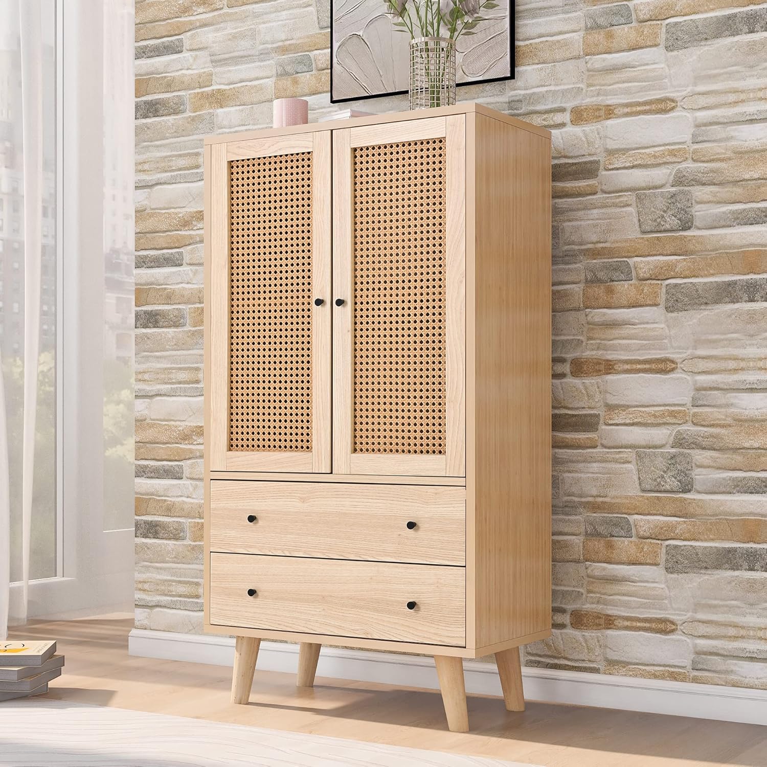 Belle commode en rotin, exactement ce que j’attendais pour l’entrée et la chambre. Les finitions sont soignées, les deux portes et tiroirs offrent un bon rangement et le montage était simple. Le meuble semble solide et apporte une touche chaleureuse à la pièce sans être encombrant. Très satisfait de la qualité-prix.