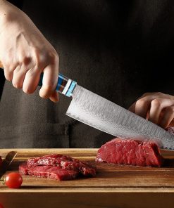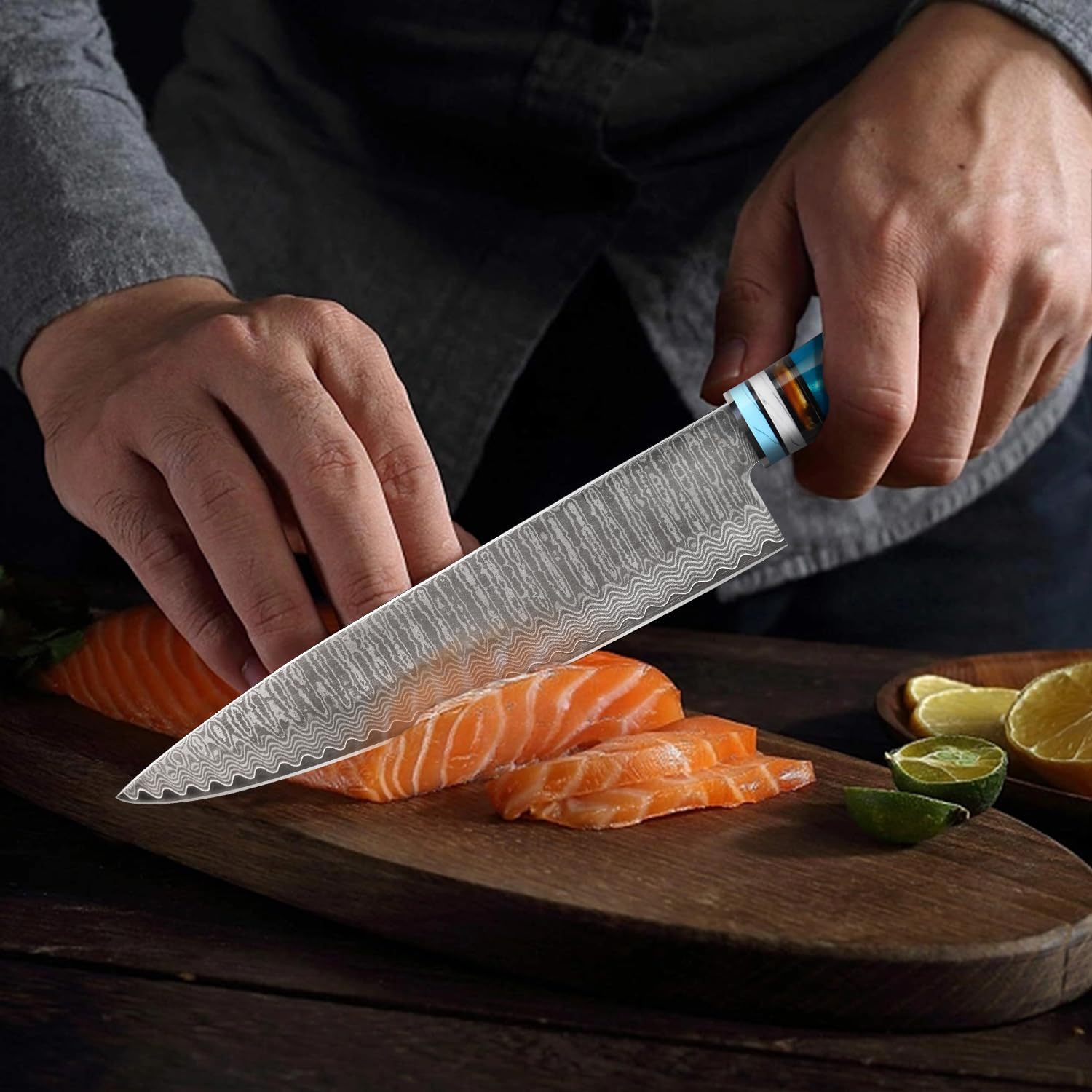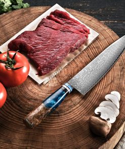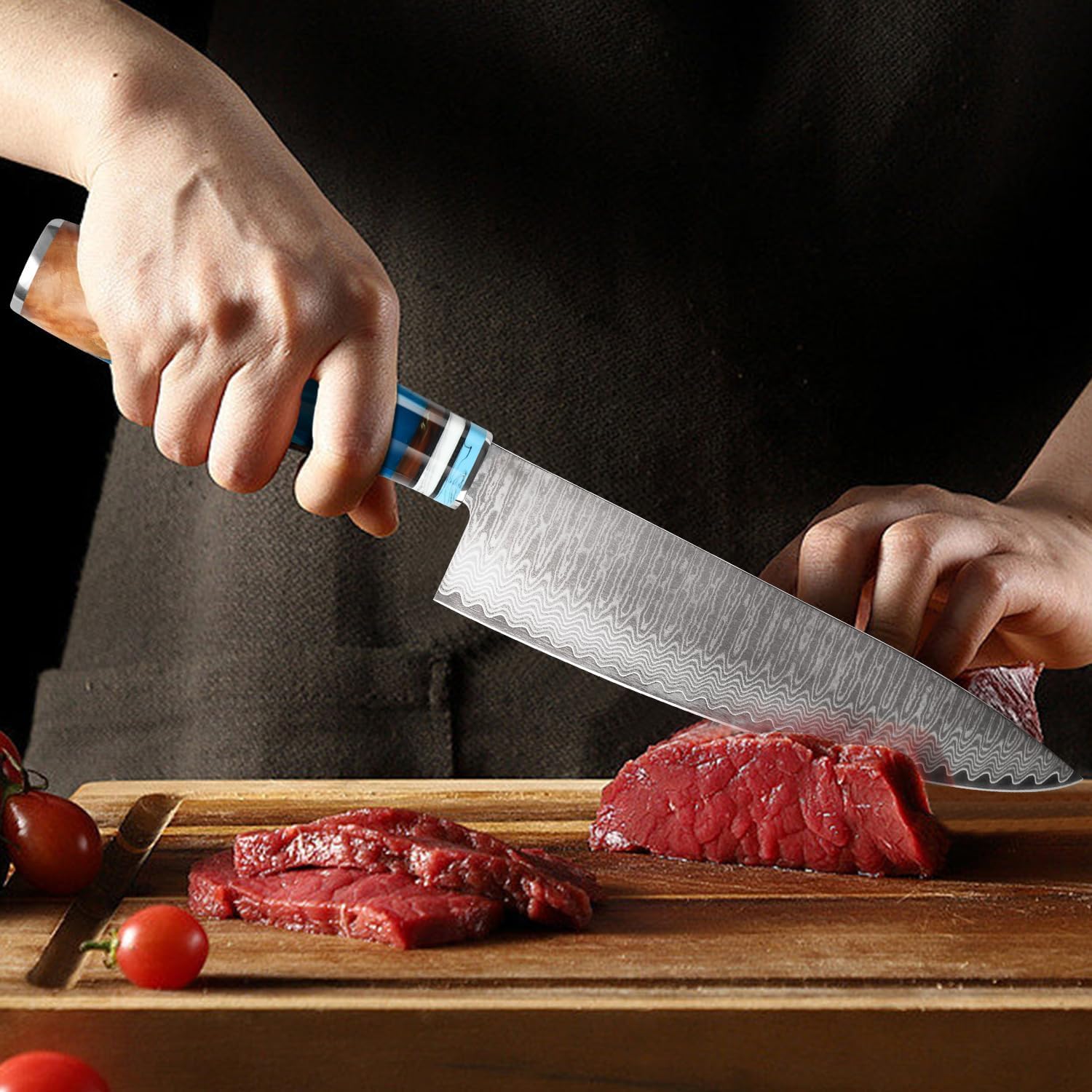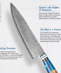 Couteau magnifique, la lame Damas de 20 cm coupe parfaitement et garde son tranchant, l’équilibre est excellent et le manche résine bleu est confortable en main, finition soignée et emballage en boîte cadeau, parfait pour la cuisine quotidienne ou comme cadeau.