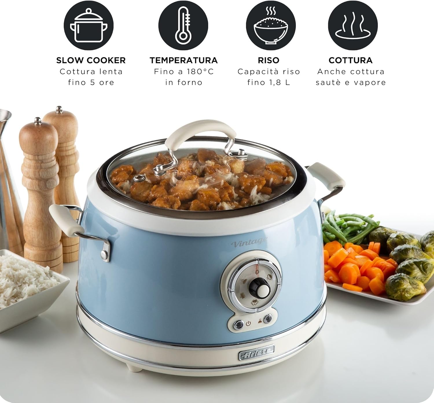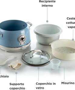 Cuiseur à riz électrique pour une cuisson parfaite du riz et de nombreux autres aliments, grâce à 5 modes de cuisson différents : riz, sauté, vapeur, chauffage et mijoteuse. Bol en céramique amovible pouvant être placé dans le four à 180°. Avec le cuiseur à riz électrique, vous pouvez préparer vos sushis préférés à la maison … mais pas seulement ! Cuire du riz nature pour préparer vos plats préférés n’a plus de secrets ! Avec Rice Cooker d’Ariete, la gamme Vintage s’enrichit d’un cuiseur à riz parfait, non seulement pour cuire le riz à la perfection, mais aussi de nombreux autres plats, en choisissant entre la cuisson sautée ou la cuisson vapeur. De nombreuses fonctions en un seul produit avec l’incontournable design Vintage d’Ariete : lignes douces, ambiance rétro et couleurs pastel pour donner une touche de style et de goût à votre cuisine !