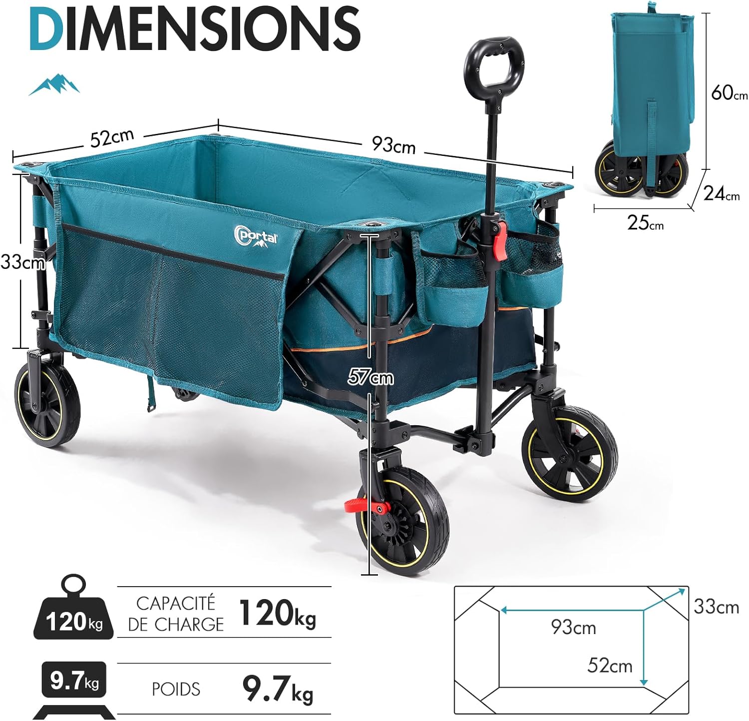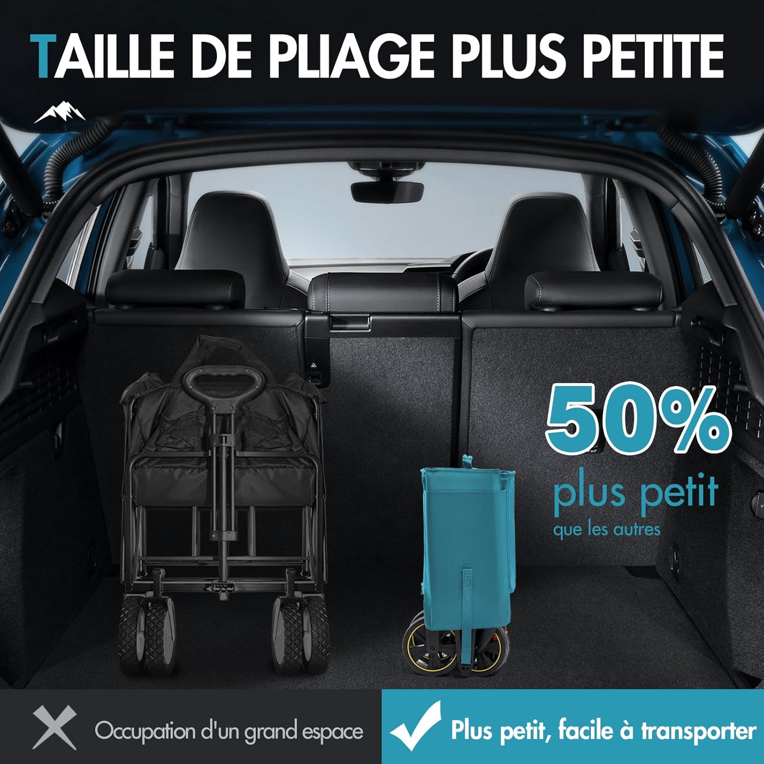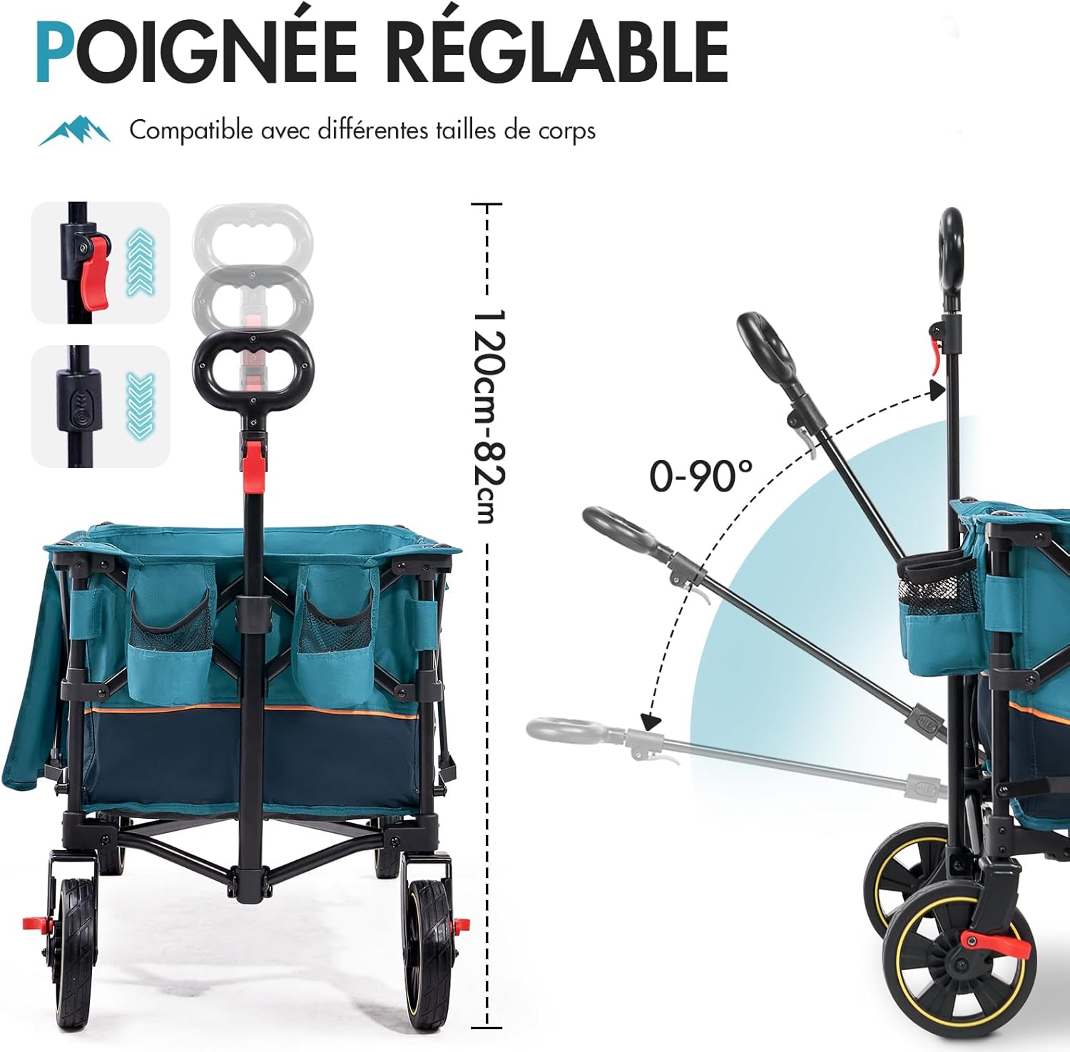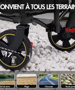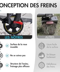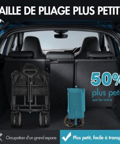 - ROUES AMÉLIORÉES : les roues spécialement améliorées du chariot de plage pliable sont équipées d’un système de freinage et les roues avant pivotent à 360 degrés. Ainsi, le chariot de plage pliable peut être facilement dirigé à la plage, sur des chemins de terre ou en ville, ménageant ainsi vos poignets et assurant une expérience confortable lors du transport de vos affaires. Que vous preniez un virage serré ou que vous alliez tout droit, ce chariot de plage pliable suit votre trajectoire et vous facilite chaque déplacement.