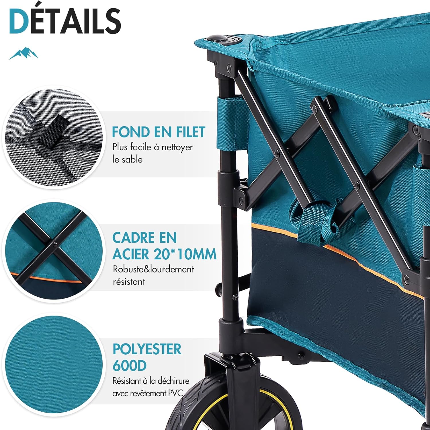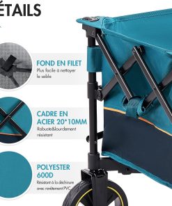 - CHARIOT DE PLAGE DE HAUTE QUALITÉ : le chariot de plage a une très grande capacité et peut facilement contenir tout l’équipement nécessaire à une sortie à la plage. Son cadre très résistant est en acier de qualité de 20 mm×10 mm et peut supporter jusqu’à 120 kg, ce qui garantit sécurité et stabilité lors du transport de charges lourdes. L’intérieur est en toile Oxford 600D épaissie de haute qualité, qui se caractérise par une grande résistance à la déchirure, à l’abrasion et à la décoloration.