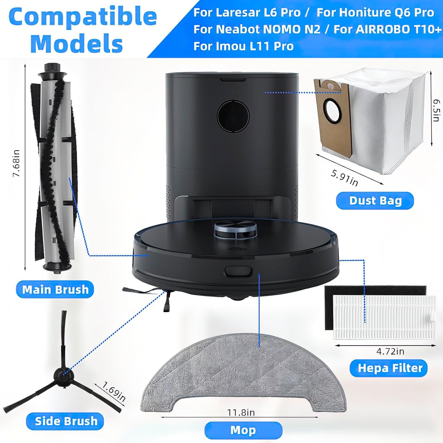 ❌ Non pour Honiture Q6. Veuillez vérifier si les modèles correspondent avant d’acheter. 🔍 Compatible avec les modèles de robots aspirateurs suivants : ✅ Compatible avec Honiture Q6 Pro ✅ Compatible avec Laresar L6 Pro ✅ Compatible avec Imou L11 Pro ✅ Compatible avec AIRROBO T10+ ✅ Compatible avec Neabot NoMo N2 📦 Liste des paquets : 2 x Brosses Principales 4 x brosses latérales 4 x filtres hepa 4 x lingette Serpillière 3 x sacs d’aspirateur
