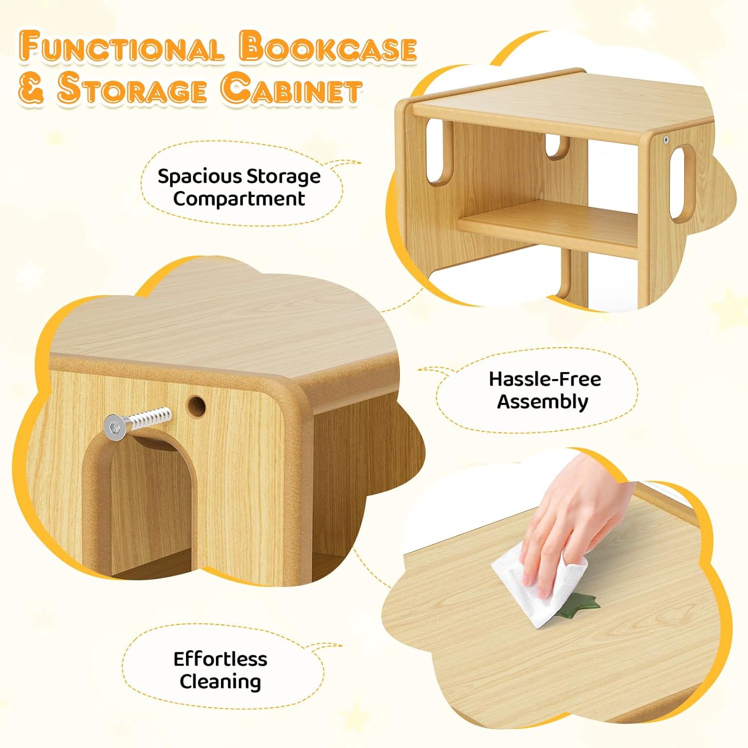 Super ensemble Montessori, solide et facile à monter, la table et les chaises sont à bonne hauteur et la petite clôture est pratique pour ranger livres et jouets; parfait pour lire, jouer et goûter, finition douce, facile à nettoyer et très stable, idéal pour les enfants de 1 à 3 ans.