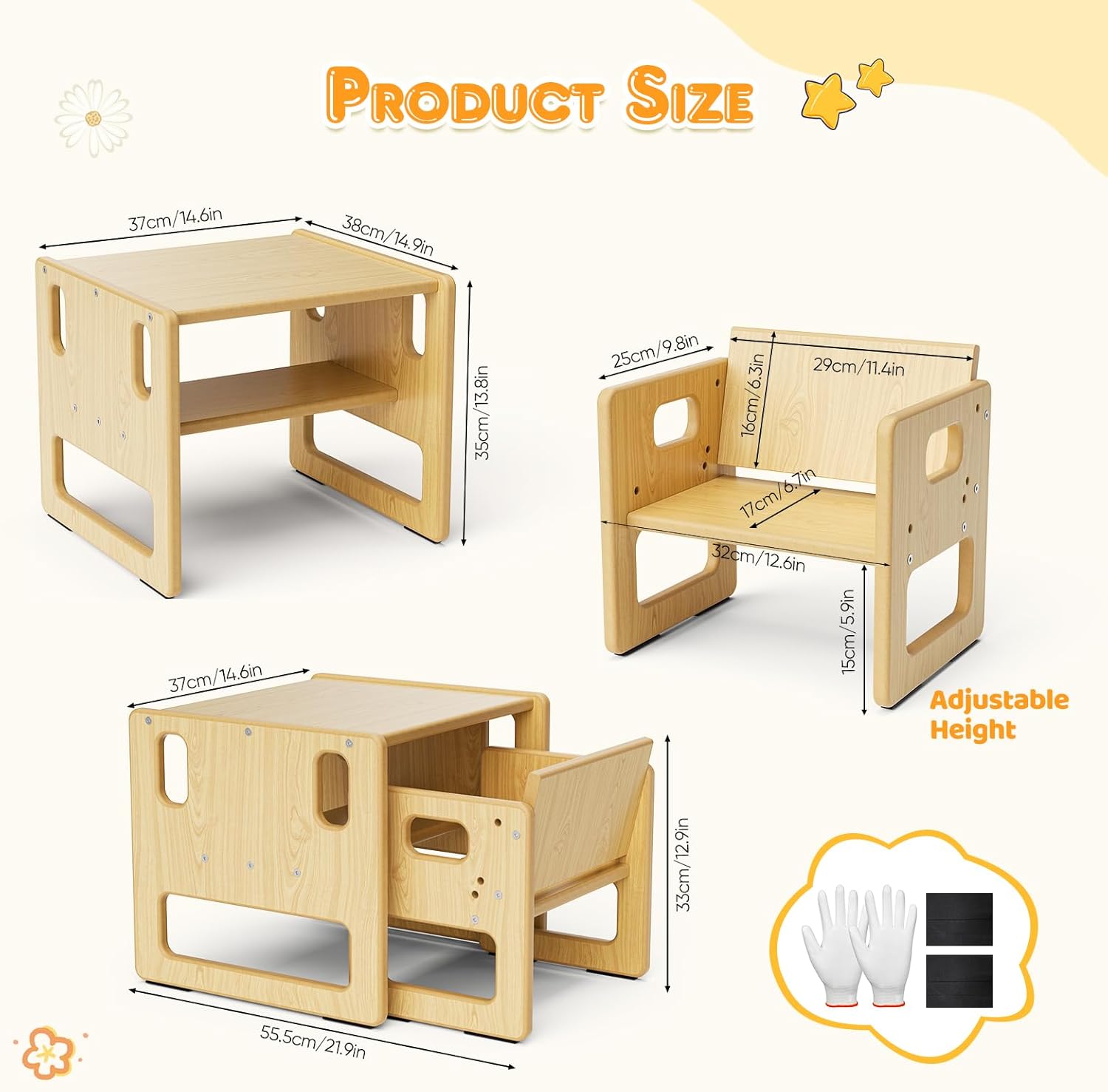 Ensemble très pratique et adapté aux tout-petits : la table et les chaises sont stables, la petite clôture est utile pour organiser les activités et le design est simple et sécurisant. Montage rapide, matériaux qui semblent résistants et taille parfaite pour lire, jouer ou prendre le goûter en autonomie. Je recommande.