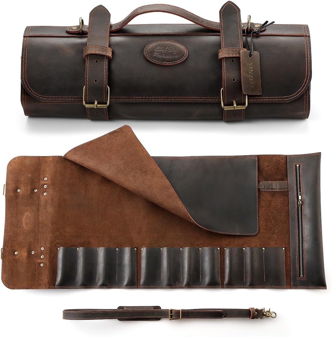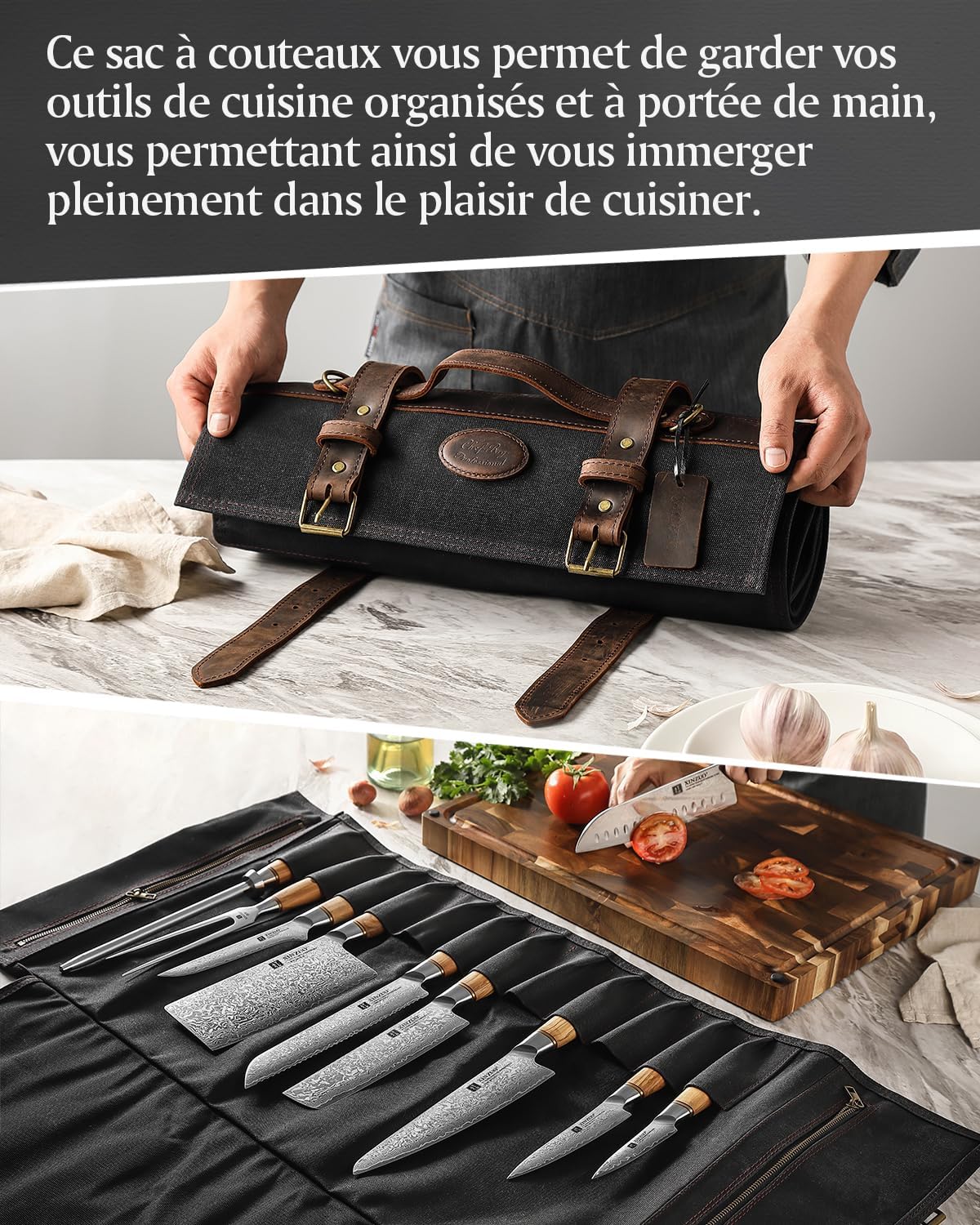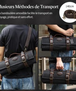 - 【Facile à Transporter】La poignée ergonomique permet de transporter les couteaux en toute sécurité. Elle est équipée d’une bandoulière détachable et réglable (140cm) qui peut être facilement attachée ou retirée selon les besoins. Le sac à couteaux dispose de trois options de portage : en bandoulière, à la main ou sur le côté, ce qui permet d’emporter facilement et rapidement vos couteaux en déplacement.
