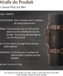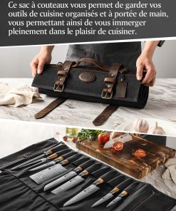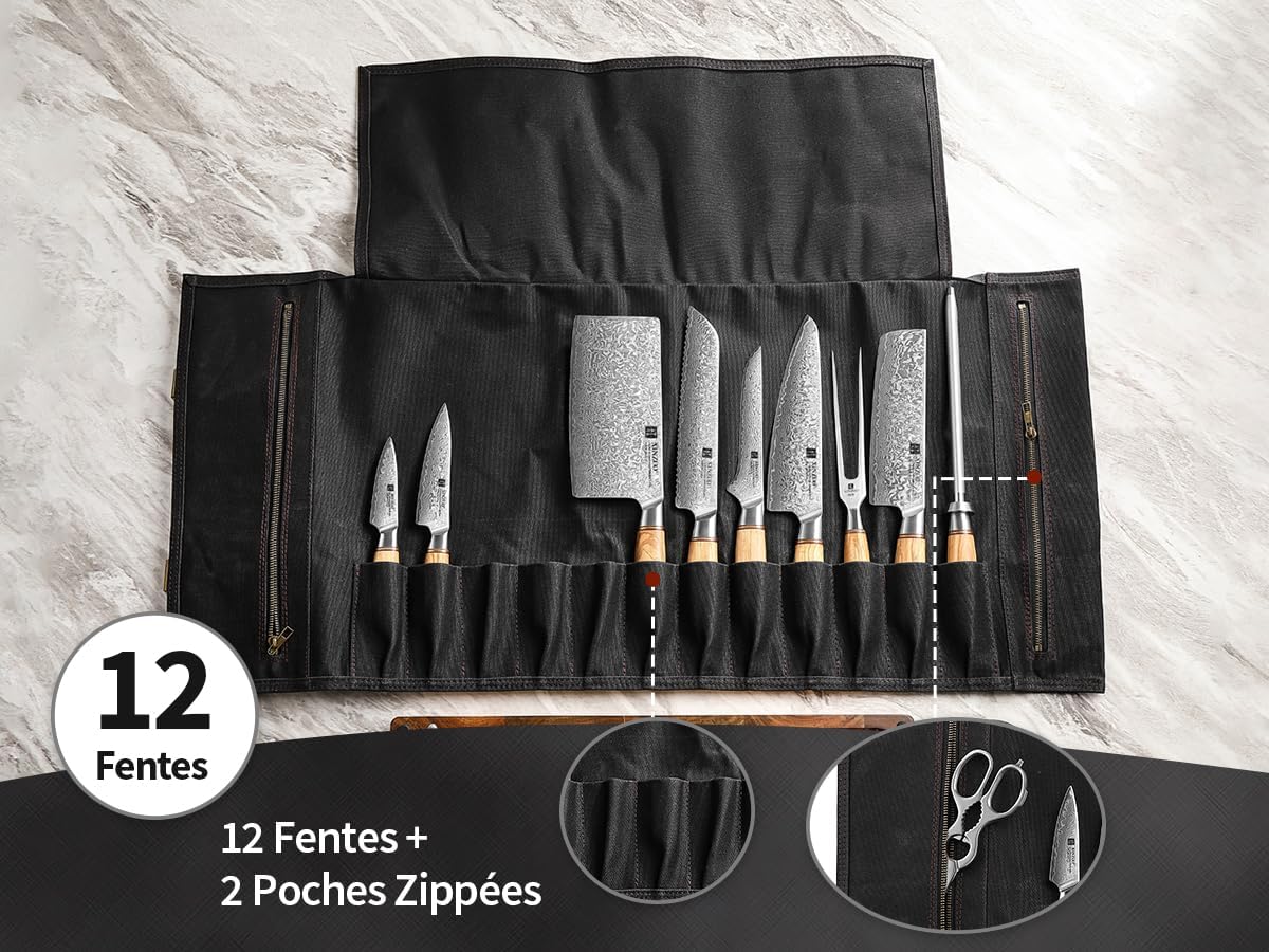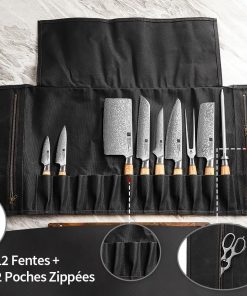 - 【Grande Capacité】 Le sac à couteaux se déplie pour atteindre une taille de 90cmx43cm avec 12 poches à couteaux (chacune mesurant 5cmx12cm), ce qui en fait le sac de rangement parfait pour tous vos couteaux et outils de cuisine précieux. Avec 2 poches intérieures zippées, il est parfait pour ranger des blocs-notes, des recettes ou d’autres petits outils pratiques et objets personnels.