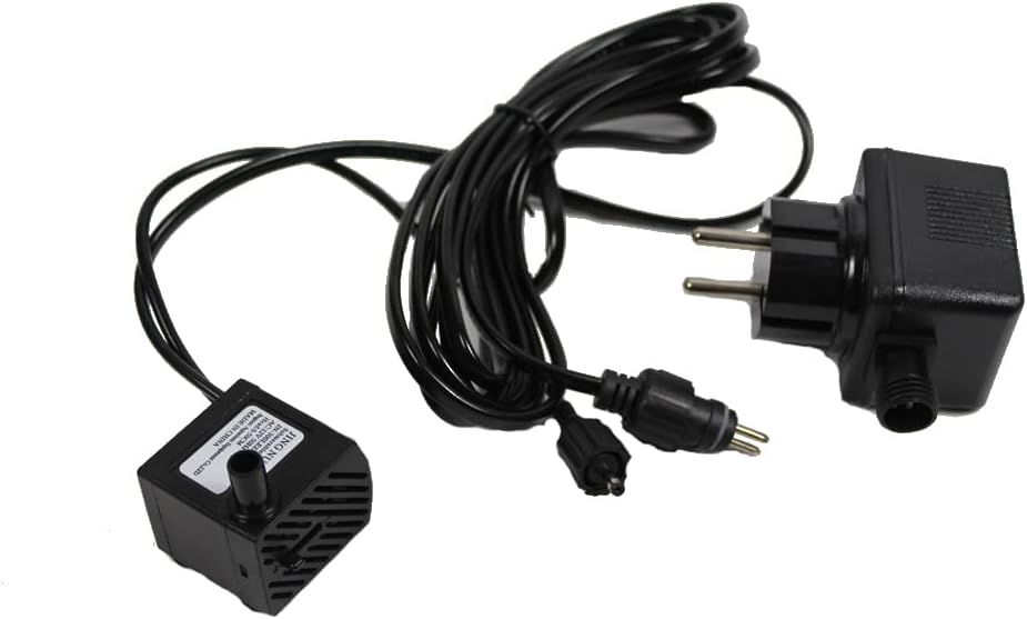 Fontaine en résine avec cascades ARNUSA, dimensions constatées 500 x 300 x 220 mm, poids 3,9 kg, résine gris pierre, étanche pour la partie fontaine, IP44 pour le bloc adaptateur, câble 3 m, pompe 3W 12V et LEDs blanc chaud. Plutôt satisfait : installation sans souci, fonctionne plusieurs heures par jour sur programmateur, eau distillée maintient l’eau propre et peu d’entretien ; en période chaude il faut remplir l’eau chaque semaine pour que la pompe reste immergée et en hiver je vidange et retire la pompe pour éviter le gel. Rendu esthétique agréable, pas de bruit, possibilité d’ajouter des plantes pour un effet naturel.