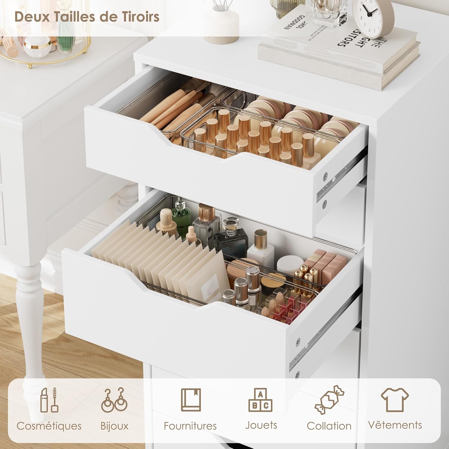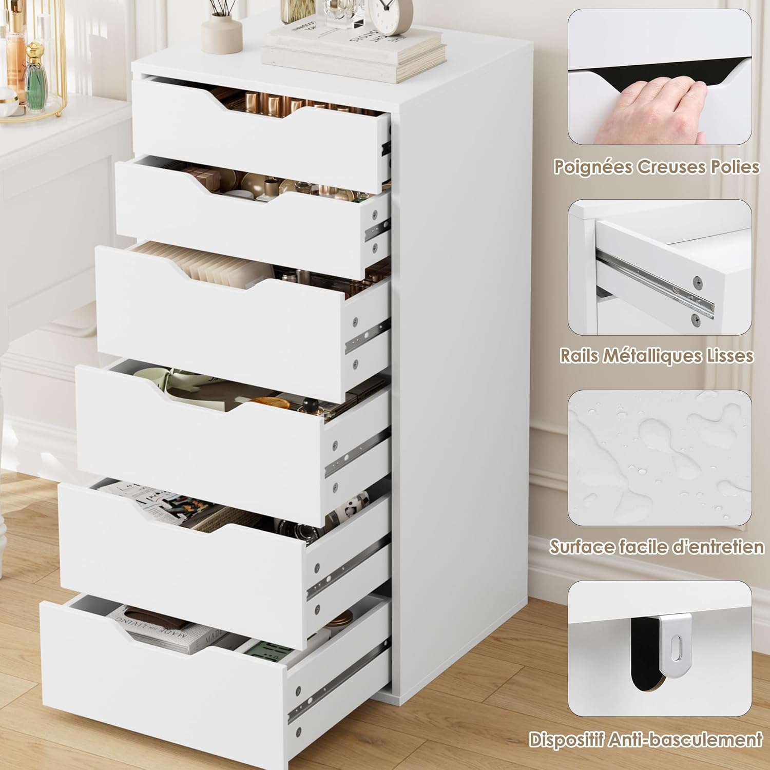 - Rangement multicouche : Cette commode chambre à 6 tiroirs vous permet d’optimiser facilement les petits espaces et d’augmenter l’espace de rangement vertical. 4 grands tiroirs inférieurs permettent de ranger des objets plus volumineux comme des vêtements et des livres. 2 petits tiroirs de commode permettent de ranger cosmétiques, produits de soins, bijoux, etc