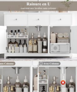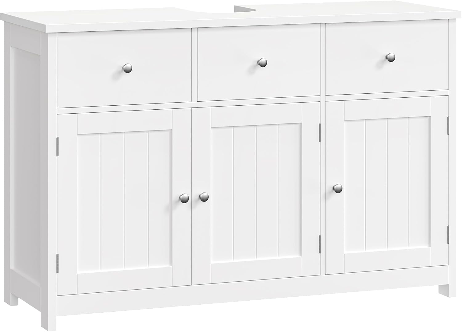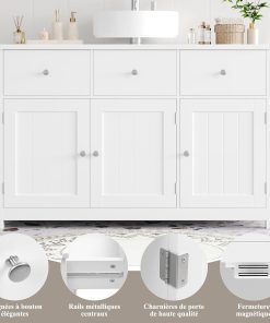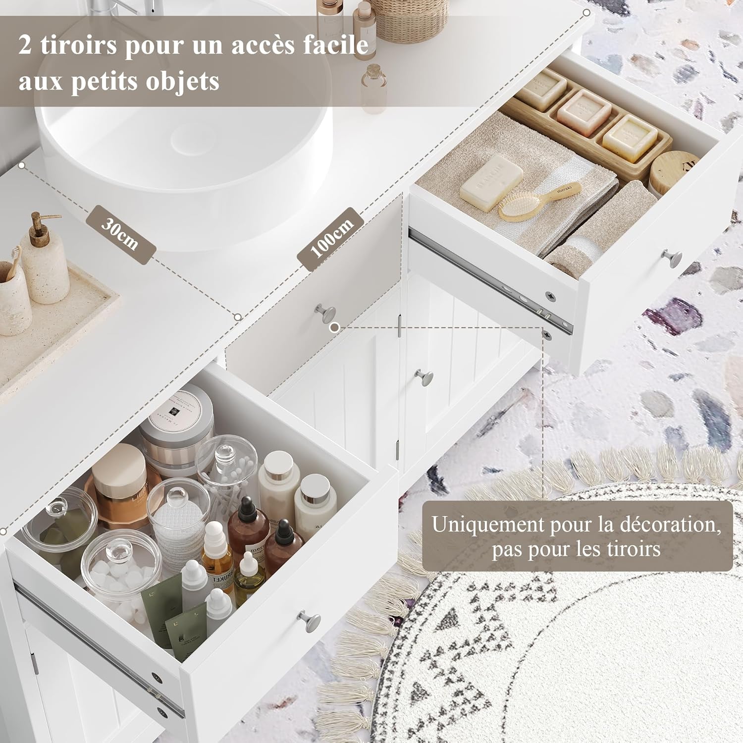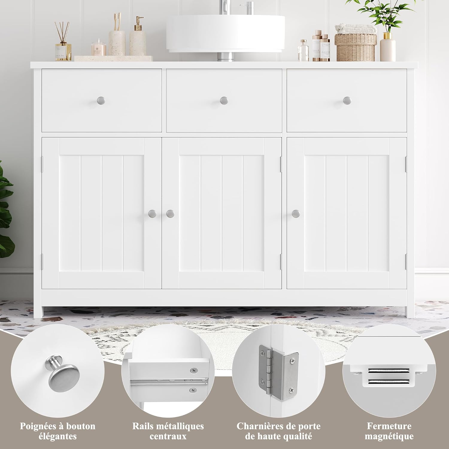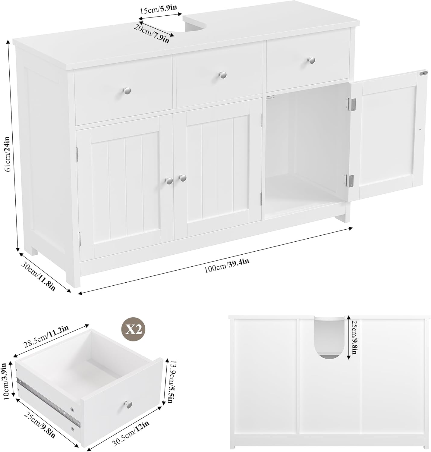 FOREHILL Meuble sous Lavabo 100cm, Meuble de Salle de Bain sous Vasque, Meubles de Salle de Bain Rangement avec 3 Portes 2 Tiroirs sur Pieds 100x30x61cm Blanc