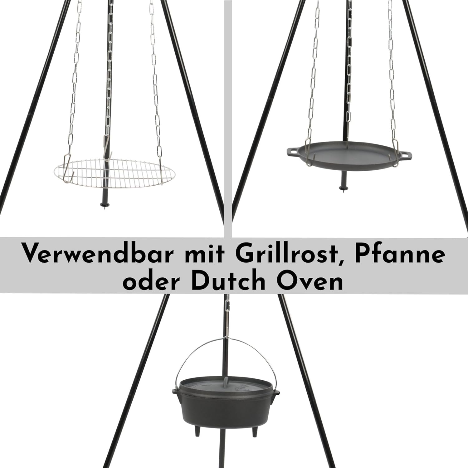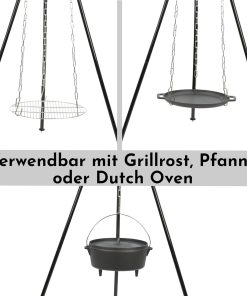 - APPLICATION | Il suffit de placer le trépied au-dessus de la cheminée et d’accrocher le four hollandais, la poêle ou le gril sur les râteaux des chaînes. Dutch Oven permet de préparer facilement des plats tels que de la viande braisée, des ragoûts, du pain, des gâteaux et bien d’autres choses encore.