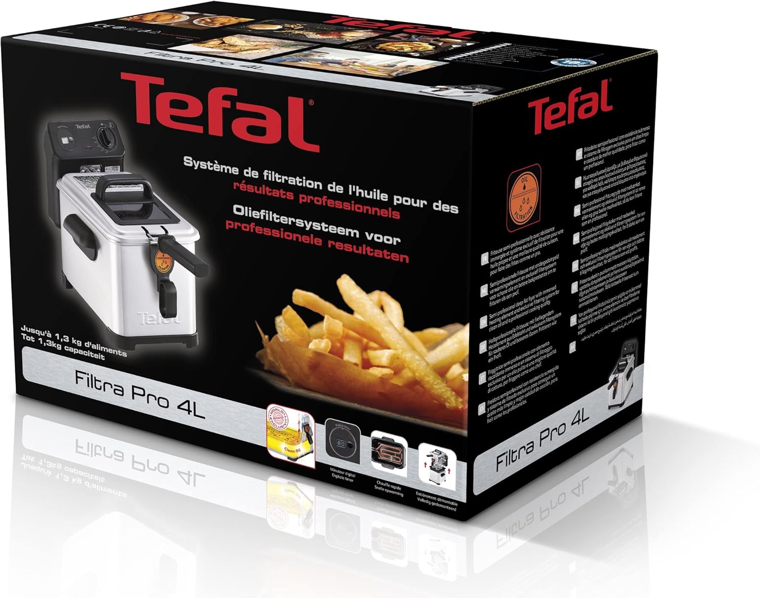 Filtra Pro est une friteuse semi-professionnelle avec la technologie de zone froide. Avec sa capacité de 4 litres d'huile, vous pouvez faire cuire jusqu'à 1,3 kg de délicieuses frites. Il dispose d'un tamis filtrant breveté que vous pouvez utiliser après chaque friture ainsi il n'y a aucun résidu et votre huile reste propre. L'élément chauffant immergé garantit des résultats rapides et parfaits. Filtra Pro peut être entièrement démontée et tous les éléments, sauf le bloc chauffant, sont compatibles avec le lave-vaisselle. Il est équipé d'un thermostat réglable et d'une minuterie mécanique. Le couvercle peut être utilisé pendant la friture et dispose d'une fenêtre de visualisation pour surveiller facilement votre cuisson. le couvercle est équipé d'un filtre métallique permanent.