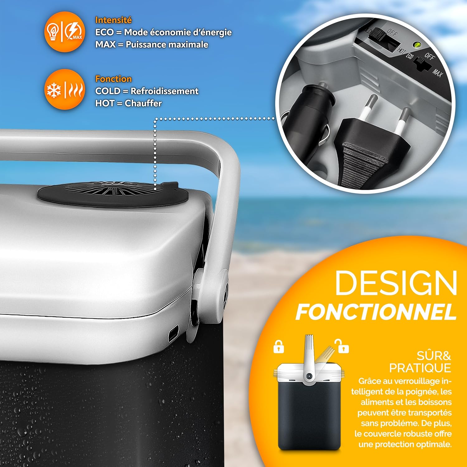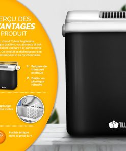 - AVEC UNE POIGNÉE ET GRILLE : La poignée pratique permet de transporter facilement la glacière. La grille amovible permet de séparer les aliments et les boissons et facilite le nettoyage. Le couvercle amovible, le loquet de verrouillage du couvercle et un compartiment pratique pour ranger le câble en toute sécurité viennent compléter le tout.
