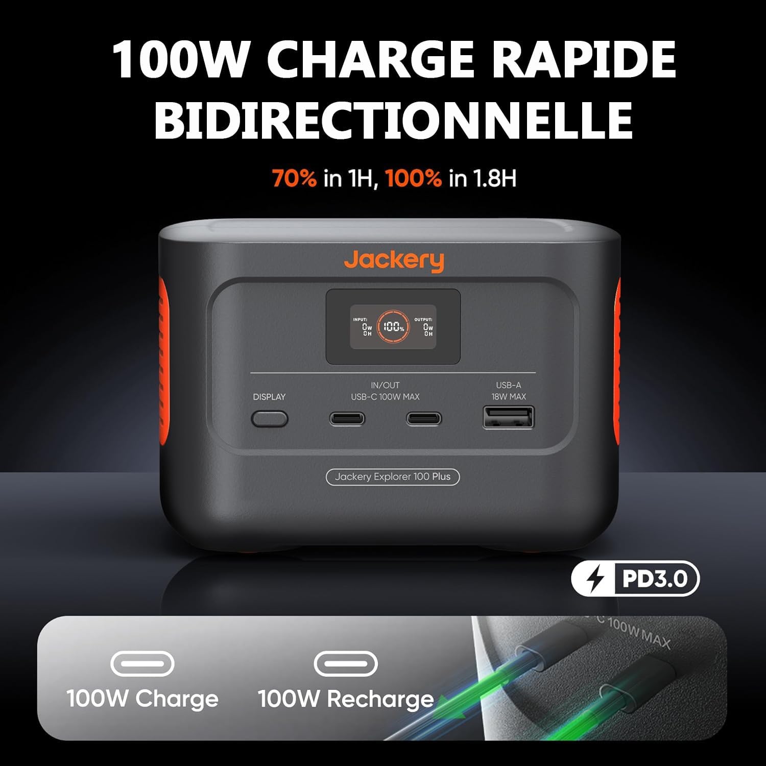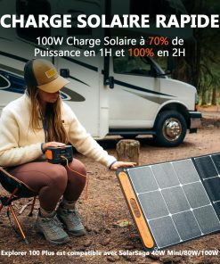 - Chargement Rapide Bidirectionnel & Chargement Solaire : Grâce à la technologie bidirectionnelle PD 3.0, Explorer 100 Plus générateur électrique portable est capable de recevoir une charge ultra-puissante de 100W et d’être complètement rechargé en 1.8H. Une fois connecté au panneau solaire SolarSaga 100W, E100 Plus peut se charger rapidement et complètement en 2H.