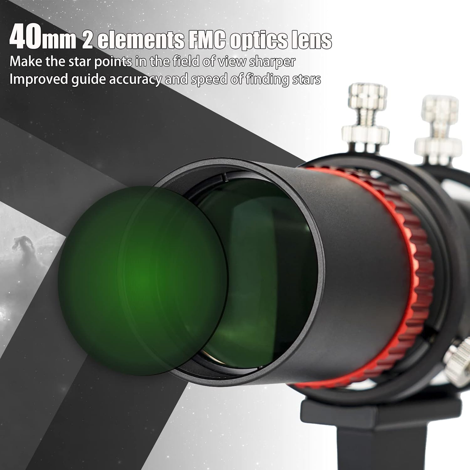 - Lentille optique FMC à 2 éléments ; rend les points d’étoile dans le champ de vision plus nets ; améliore la précision du guide et la vitesse de recherche des étoiles