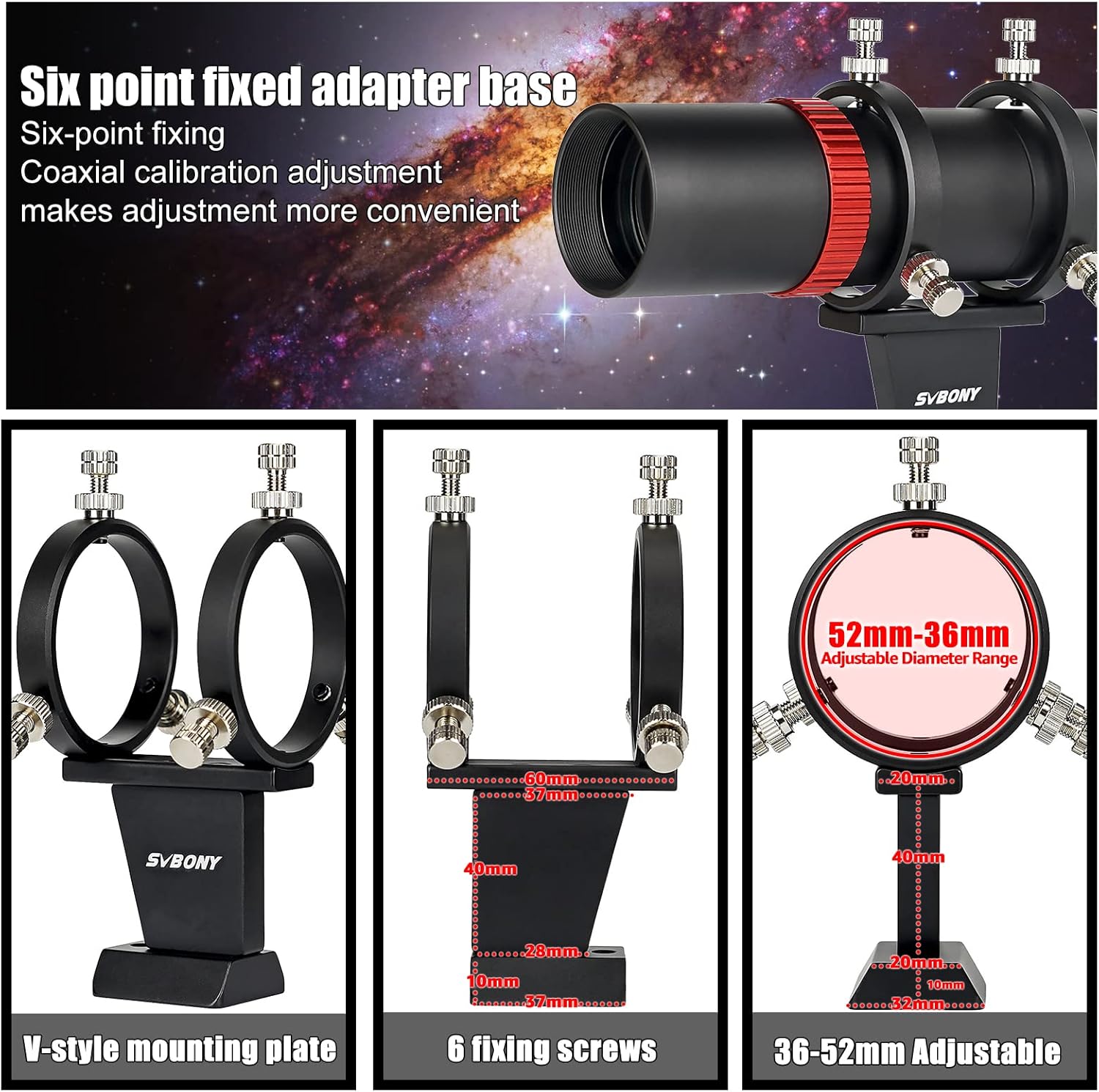 - Anneaux de guidage pour télescope à 6 points ; pratique pour le réglage de la calibration coaxiale avec votre télescope ou OTA
