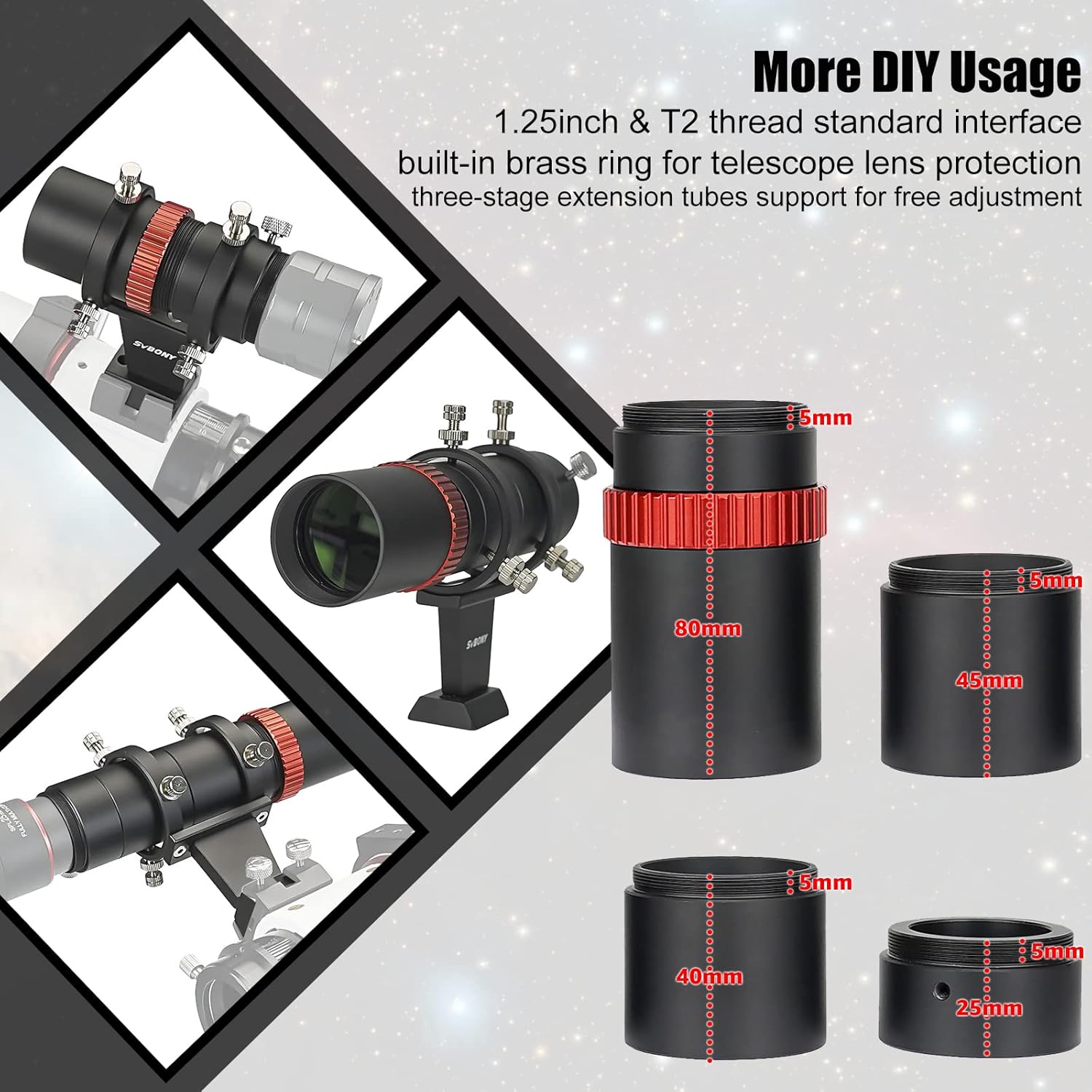 - Interface standard filetée de 1,25 pouce et T2 avec anneau en laiton intégré pour la protection des accessoires ; support de tubes d’extension à 3 niveaux pour un réglage libre