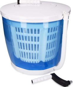 Not a replacement for a large electric washing machine—if you have limited strength this won’t work and the plastic handle can break if forced. Pros: no electricity needed, very compact, can wash a full load of baby clothes or a few adult items, spin-dry works well and clothes dry quickly, and it’s inexpensive. Cons: washing takes effort, the handle is fragile, and a little water can leak from the top. Good for camping or places without power if you have realistic expectations for a $50 plastic device.